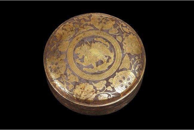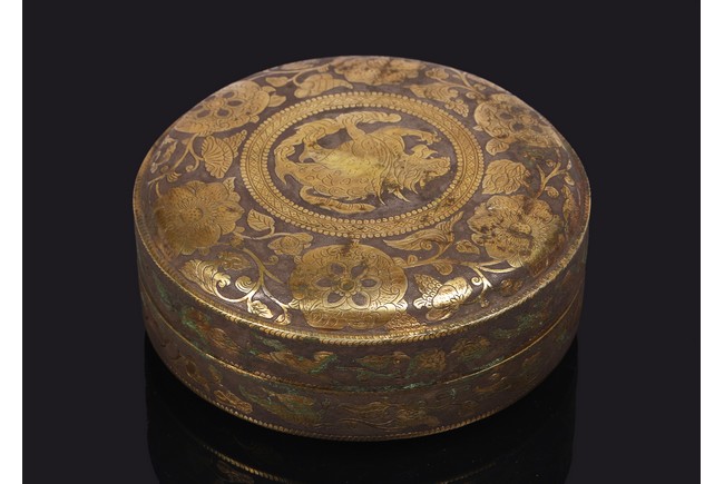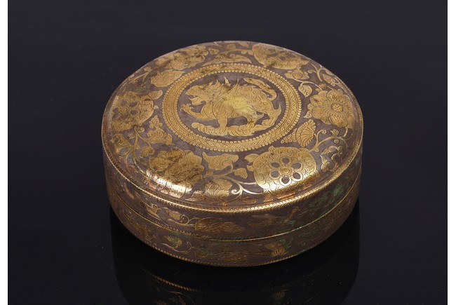 The domed top of the cover finely decorated featuring a central winged mythical creature with a raised paw and an open mouth displaying sharp fangs, surrounded by intricate foliate scrolls and blossoms along the outer border, the box base finely decorated showcasing a central flower head encircled by six large flower motifs , all highlighted in gilding and reserved on a fine ring-punched ground. Tang Dynasty period.