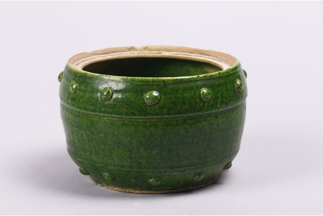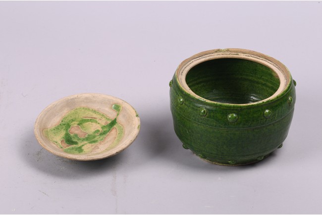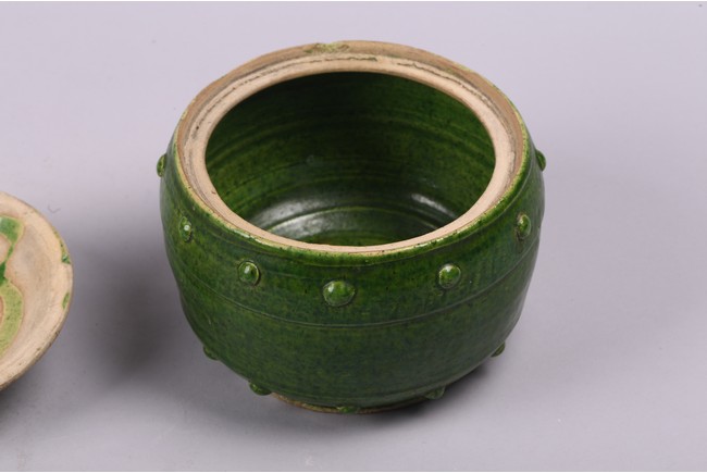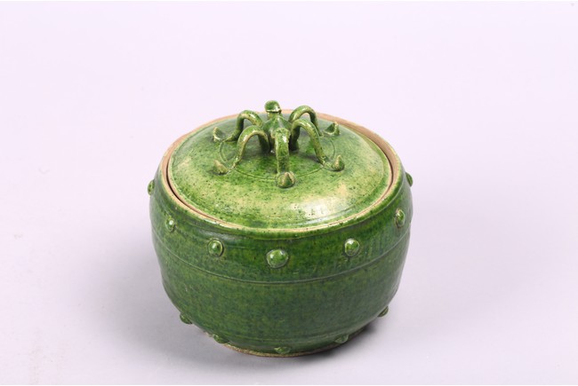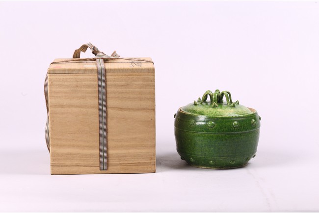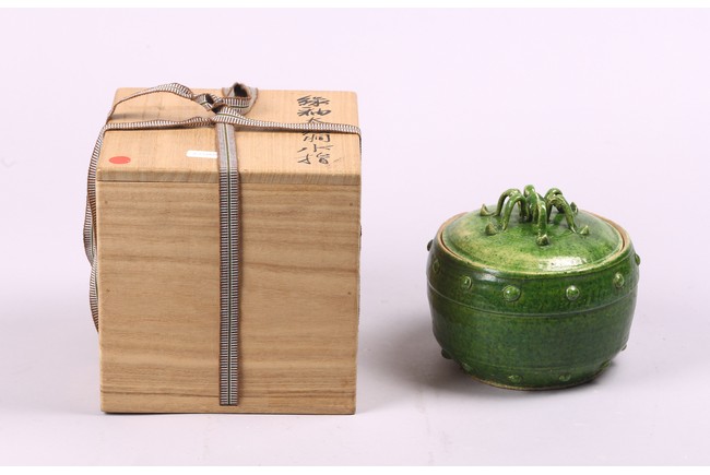 The jar is decorated in relief on the exterior two rows of bosses above and below the central body, the cover surmounted with six stems flanking a central bud, overall covered in leaf green glaze. Japanese wood box. Possibly Song Dynasty period.