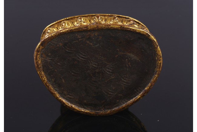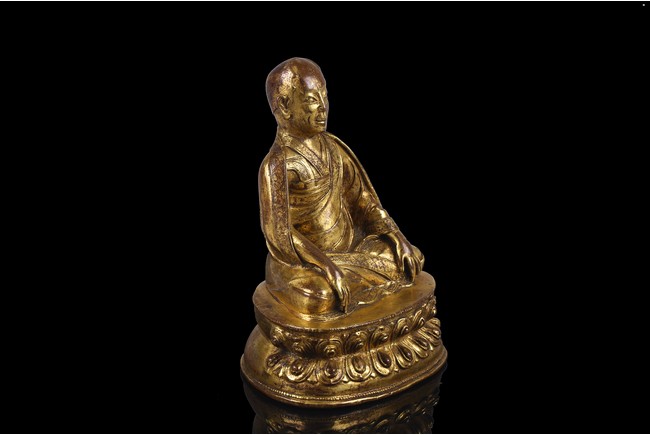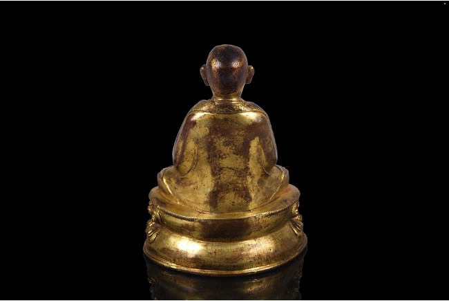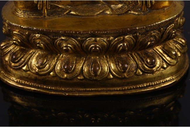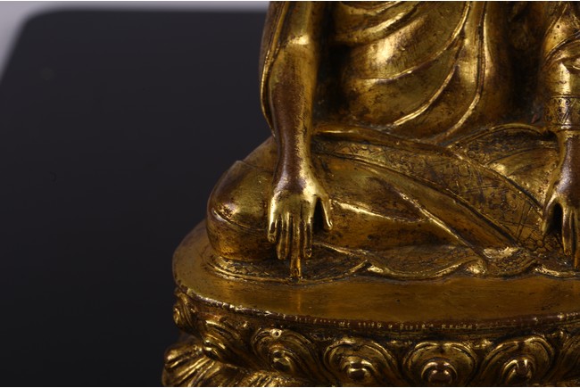 Depicted seated in dhyanasana on a double lotus base, both hands resting on the knees,wearing upper and lower robes incised with a foliate motif, the base sealed. 16-17th century.