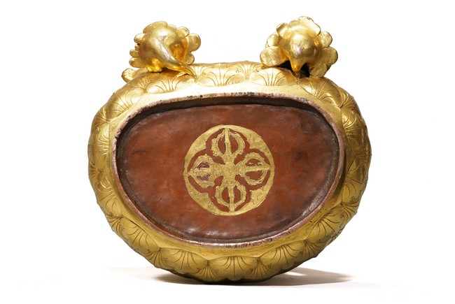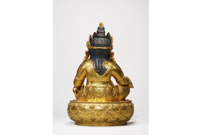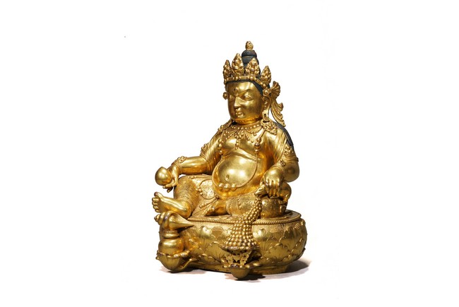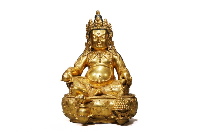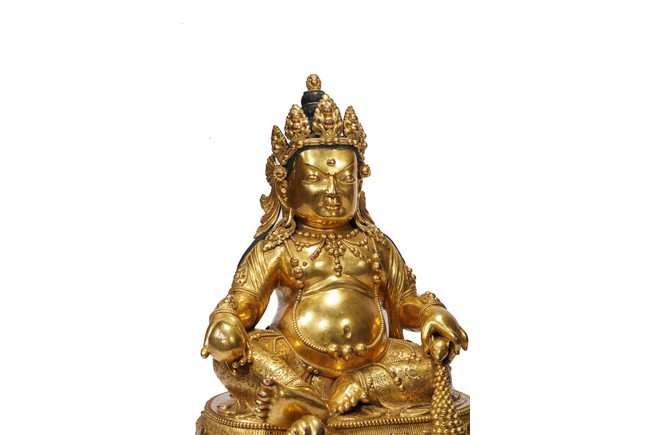Provenance: Property from an important private collection, Seattle 來源: 西雅圖私人藏家收藏 黃財神,藏文叫做“諾拉”,他的色膚是黃色,故稱為黃財神,是密教之護法神祇,為諸財神之首。其形象為上身袒露,下身着裙,右手持摩尼寶,象徵寶光普照十方,增添眾生的福報;左手抱一隻大吐寶鼠,吐寶鼠的嘴裏含着珠寶,象徵財寶。右腳踏一隻白色海螺,象徵着他能入海取寶。整尊造像體碩高大,胎體厚重,金水鋥亮,工艺讲究,全身上下透著一種雍容大气之美,是札那巴札爾造像的魅力所在。整像銅質厚實,金光鋥亮,整體雍容華貴,為蒙古造像中的精品。扎那巴扎爾(1635-1723年),出生在蒙古庫倫,被授予“一世哲布尊丹巴呼圖克圖”稱號。第一世哲布尊丹巴呼圖克圖,扎納巴扎爾既是一位活佛,又是佛像雕塑藝術家。他創造出獨具特色的蒙古佛像雕像藝術風格,後人留下了美輪美奐的傳世精湛藝術傑作。可參考紐約大都會藝術博物館藏扎納巴扎爾風格無量壽佛 Compare a Zanabazar school gilt bronze figure of Amitayus buddha, in the collection of Metropolitan Museum of Art, New York