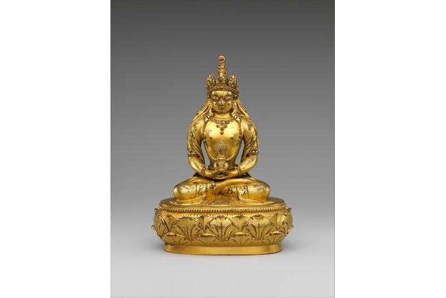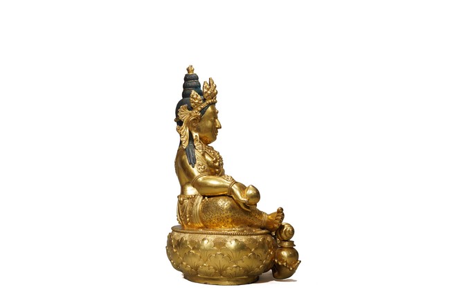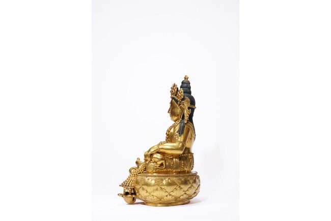 Seated upon a lotus pedestal, the god of wealth is portrayed with a lemon in his right hand and a mongoose emitting precious jewels in his left. Adorned in beaded jewelry that accentuates his ample belly, his face features a broad nose and prominent eyes framed by sizable earrings. A foliate crown rests atop his head, positioned in front of a chignon. The base sealed and incised with a double-vajra. 18-19th century, Zanabazar School, Mongolia.