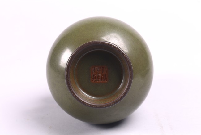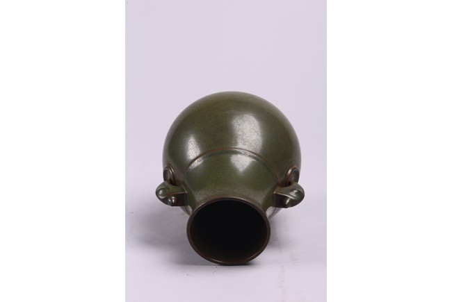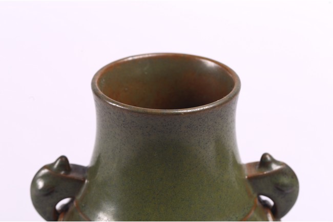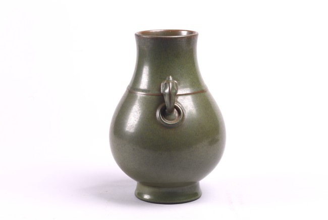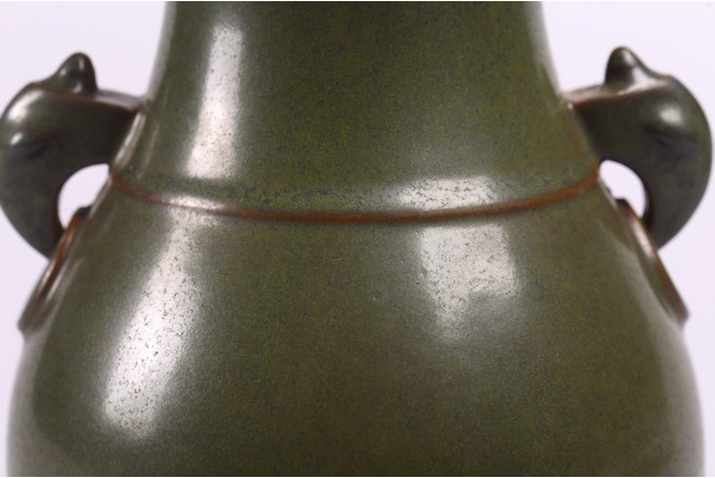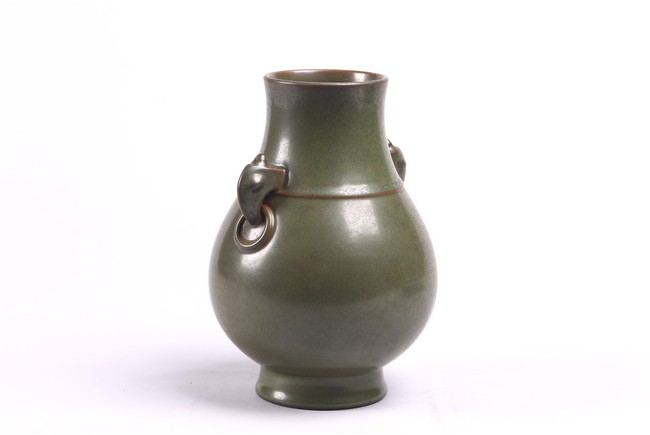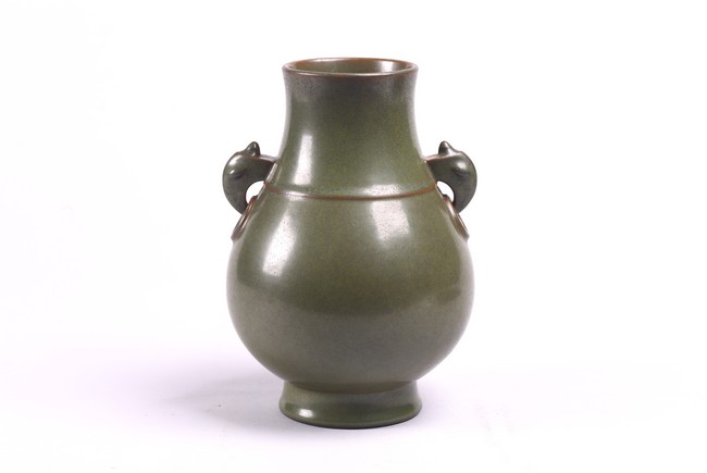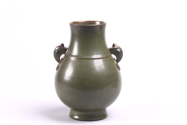 The baluster vase applied to the neck with a pair of elephant handles, overall suffused with attractive tea-dust glaze, the base inscribed with Qianlong reign mark. Qing Dynasty period.
