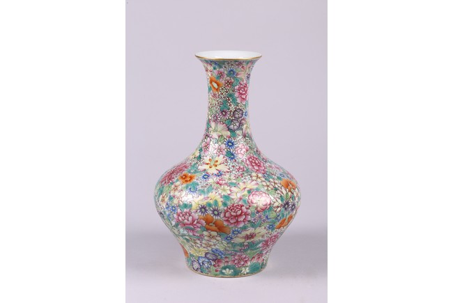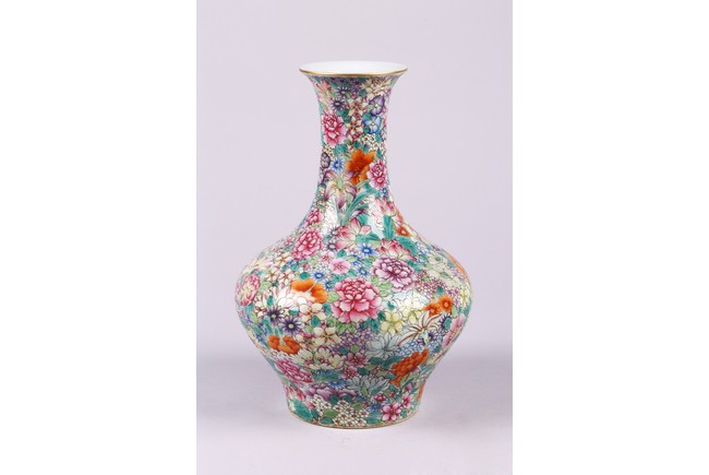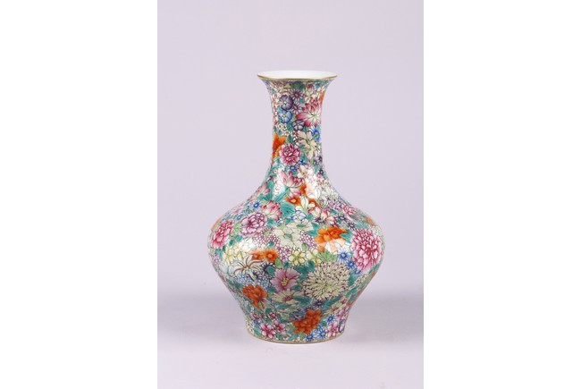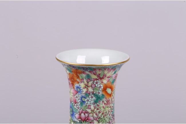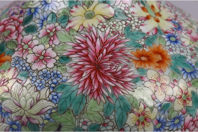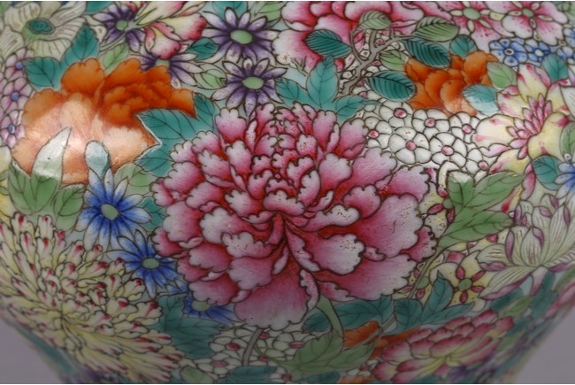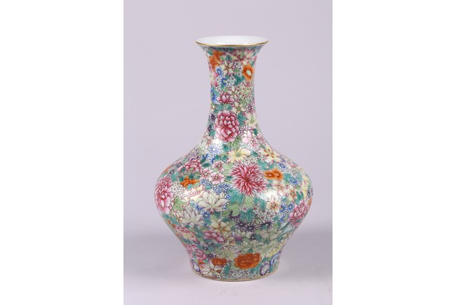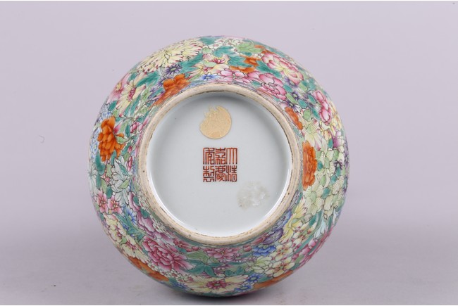 The globular body rising from a flaring foot rim to a gilt everted mouth rim, finely enamelled around the body with a dense mille-fleurs ground, the base inscribed with 'Jiaqing' reign mark. Qing Dynasty or Republic period.
