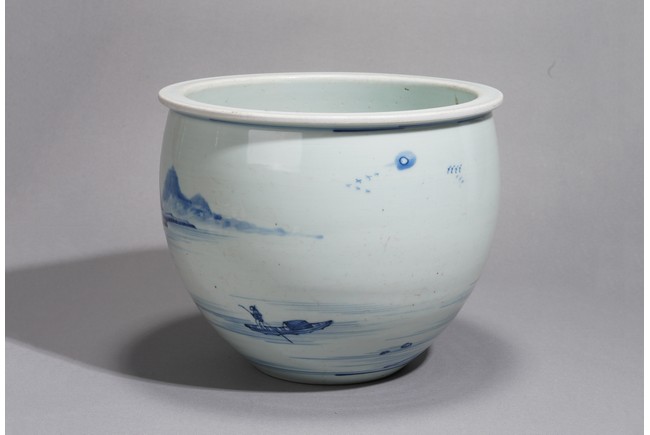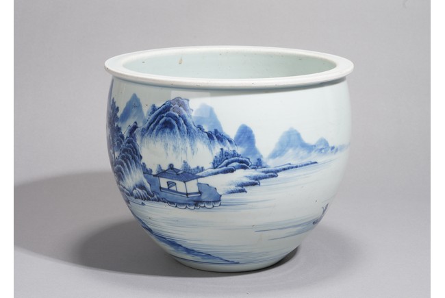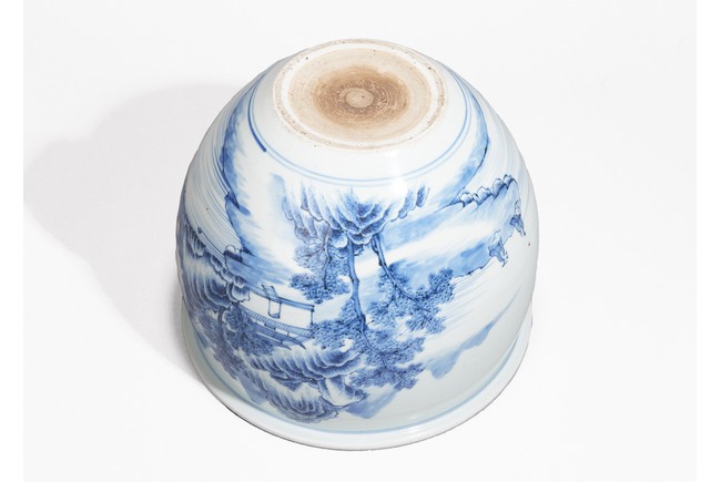The exterior decorated in soft cobalt blue with mountainous and river landscape richly detailed with huts and pavillions among trees and jagged mountains. The base unglazed. Qing Dynasty period.