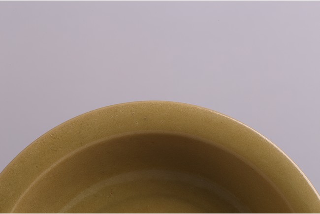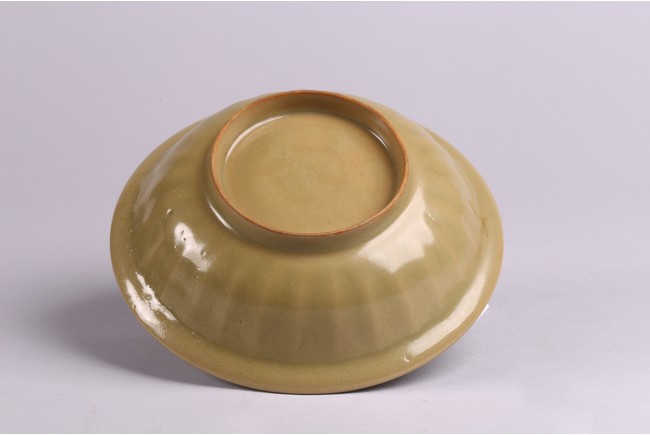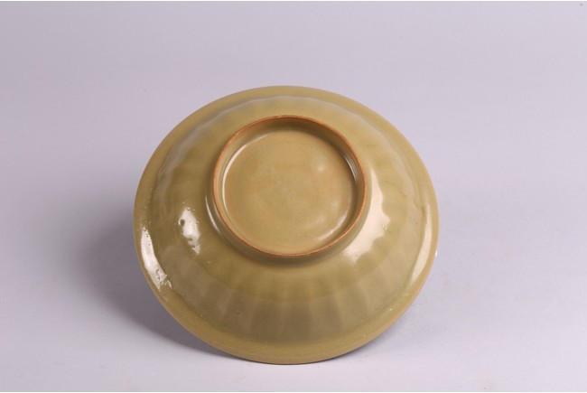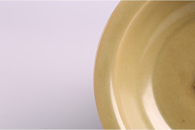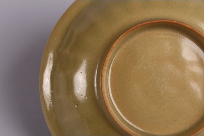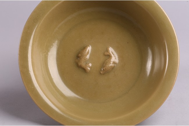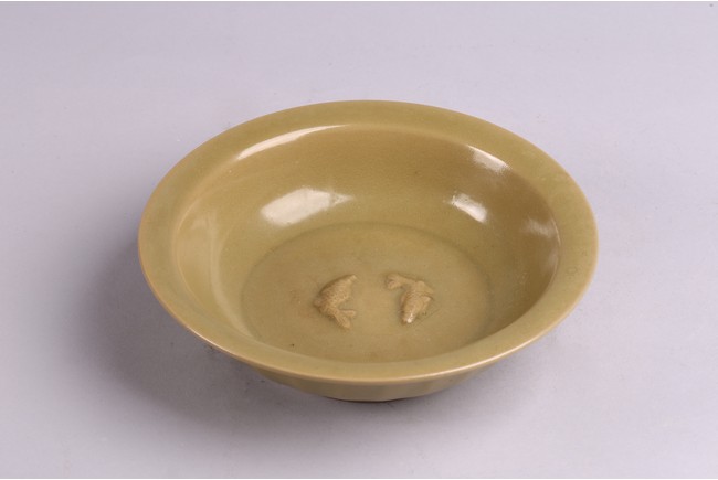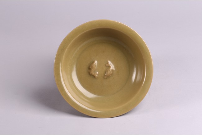Thickly potted with a wide rim, the interior moulded with two fish swimming, overall covered in brownish olive-green glaze.