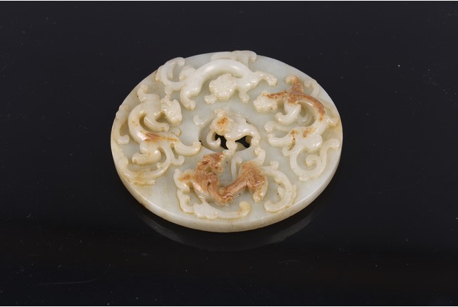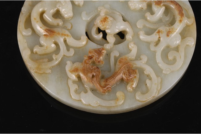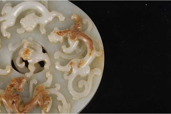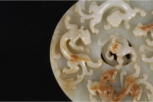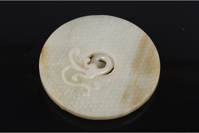 The disc is carved in high relief with five sinuous chilong with bifurcated tails. The underside is carved with archaistic dot patterns. The stone is of a white tone with some mottled russet and dark brown inclusions. Qing Dynasty period.