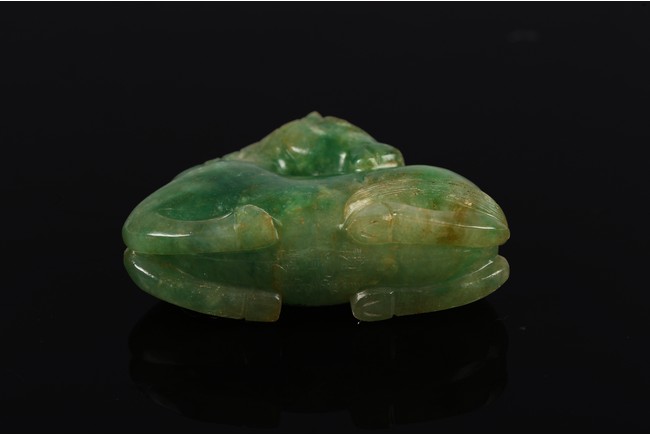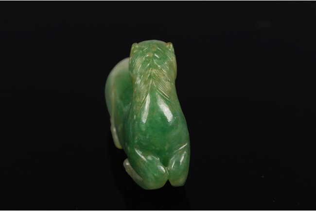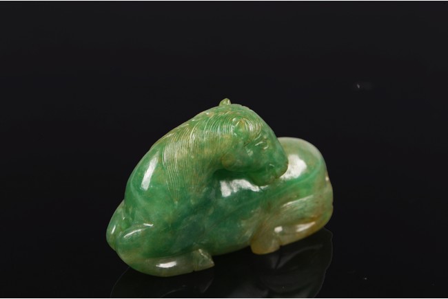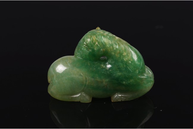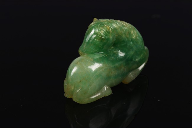 The recumbent jadeite horse seated with head turned back, the mane gracefully flowing down the neck, and tail swept to one side. The stone exhibits an appealing semi-translucent green tone adorned with russet mottlings. Qing Dynasty period.