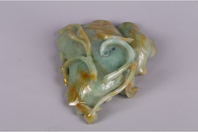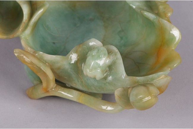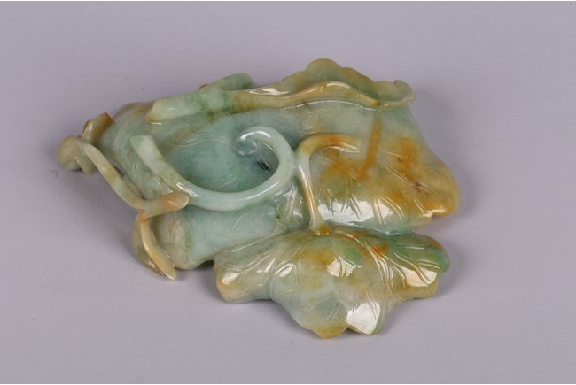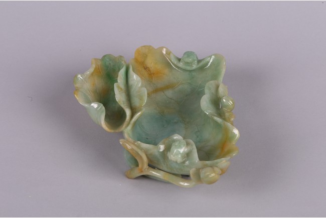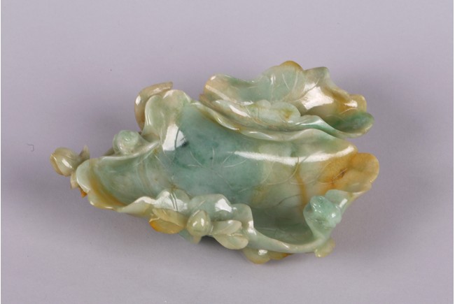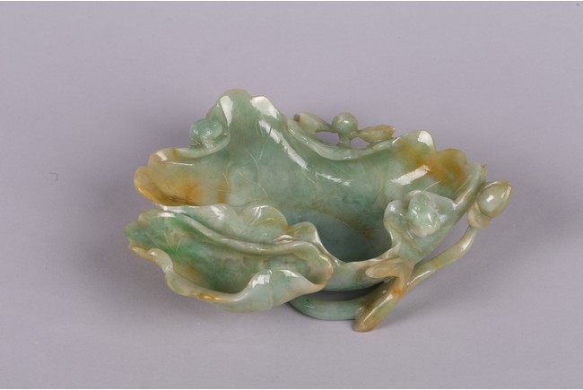 Carved in the form of two joined curled lotus leaves, the stone is of mottled green and russet tone. Qing Dynasty period.