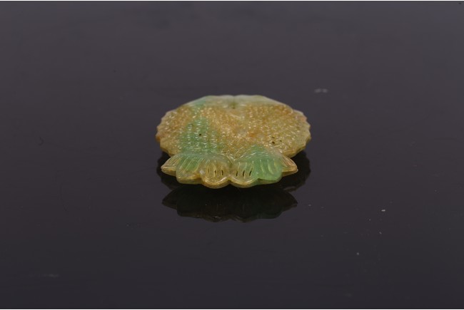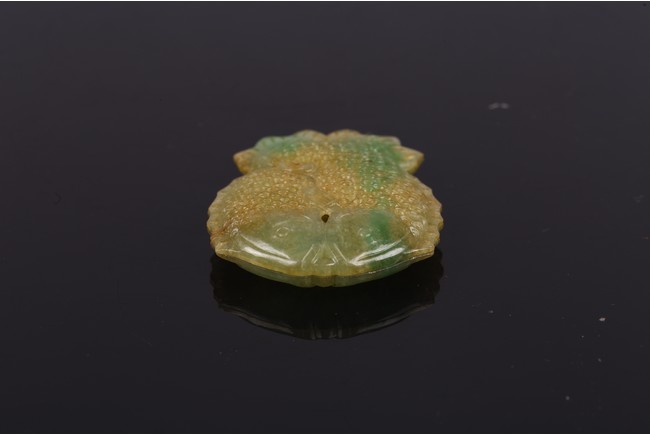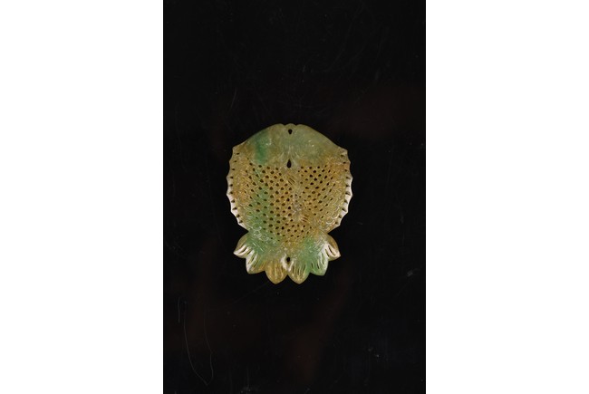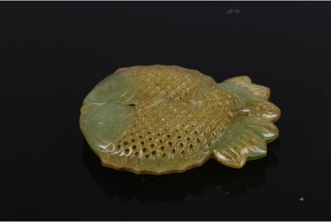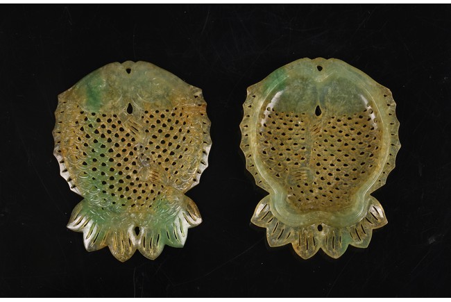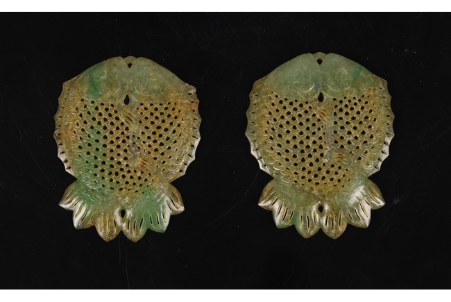 Of double carp form, the pair facing one another with overlapping fins and tails, profusely carved and pierced to each side with numerous holes, the translucent stone is of mottled green and orange brown tone. Qing Dynasty period.