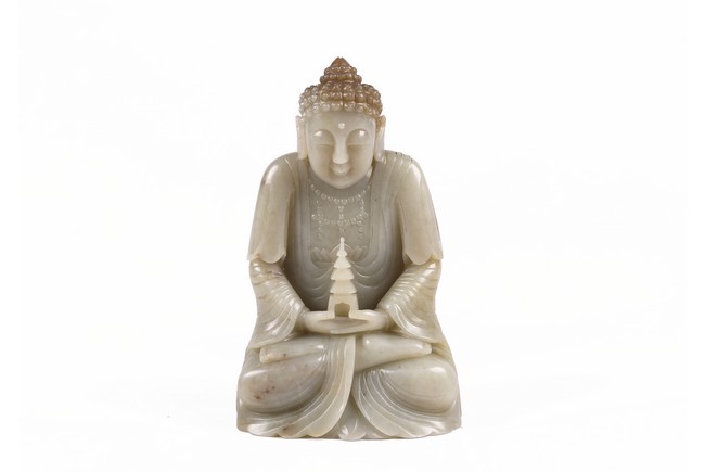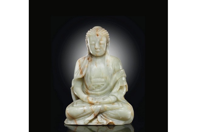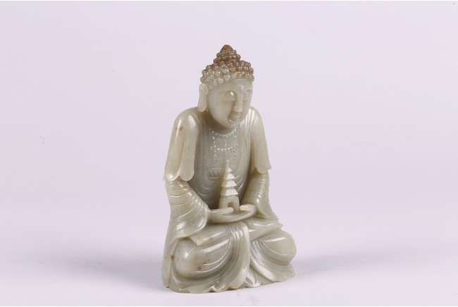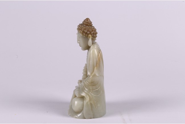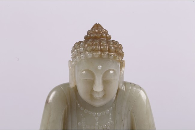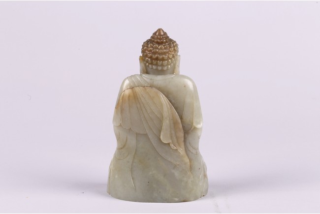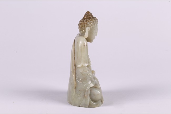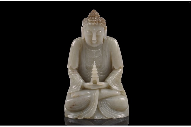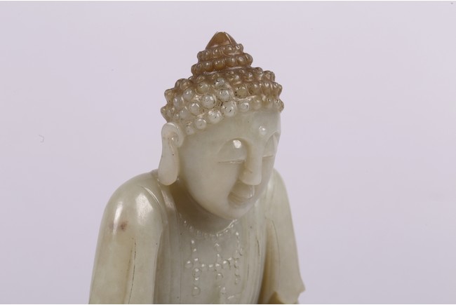 Provenance: Private collection from Northern California 來源: 北加州私人多年收藏 可參考一尊較小青白玉佛像(高17.8cm),售于紐約蘇富比,2012年3月,成交價242,500美金 Compare a smaller Buddha statue carved in greenish-white jade (height 7 in or 17.8 cm), sold at Sotheby's New York in March 2012, with final price of $242,500