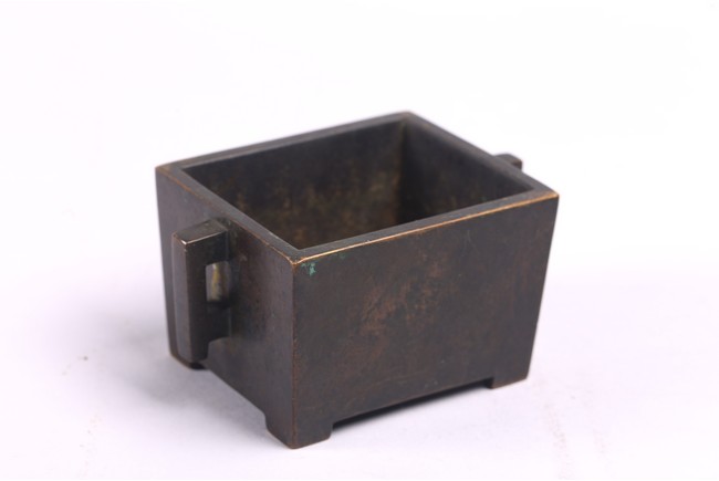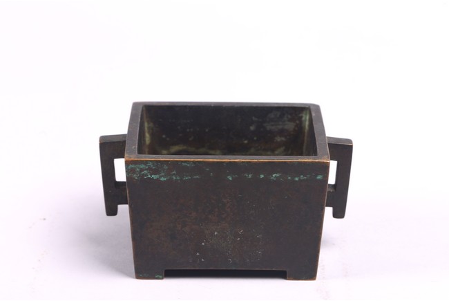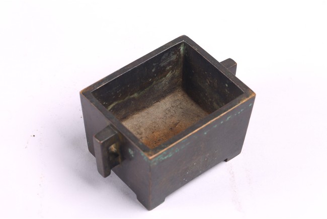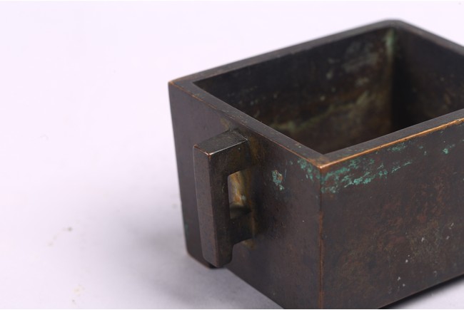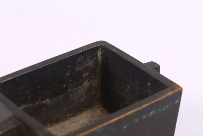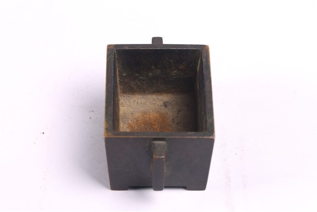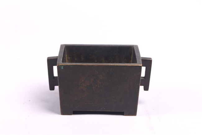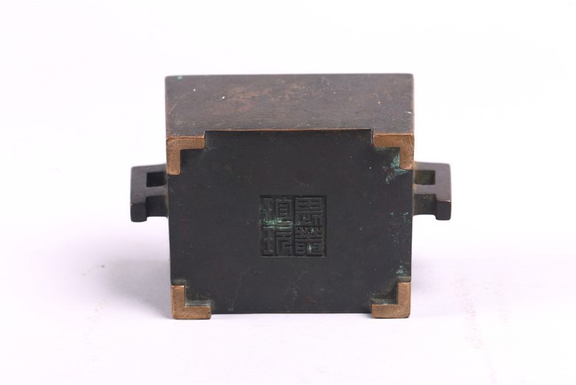 Of rectangular form with rectangular handles, richly patinated, the base cast with a four character mark. Qing Dynasty period.