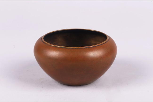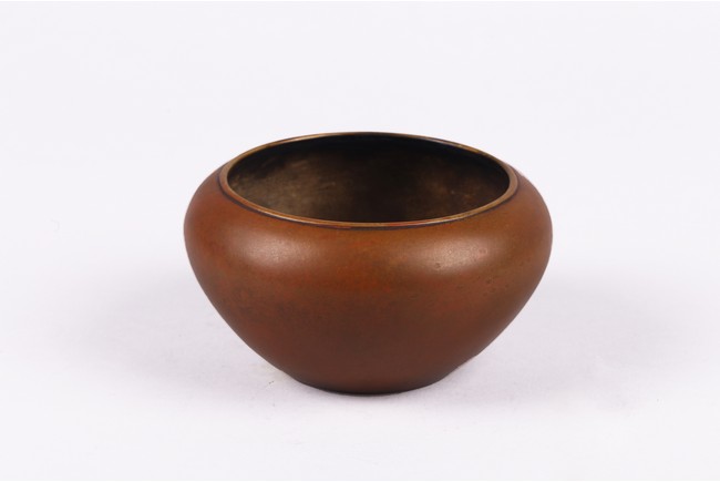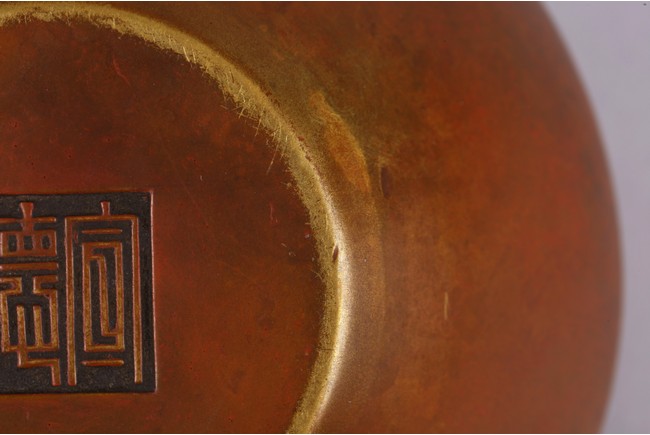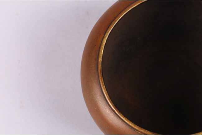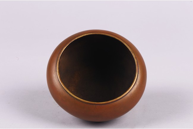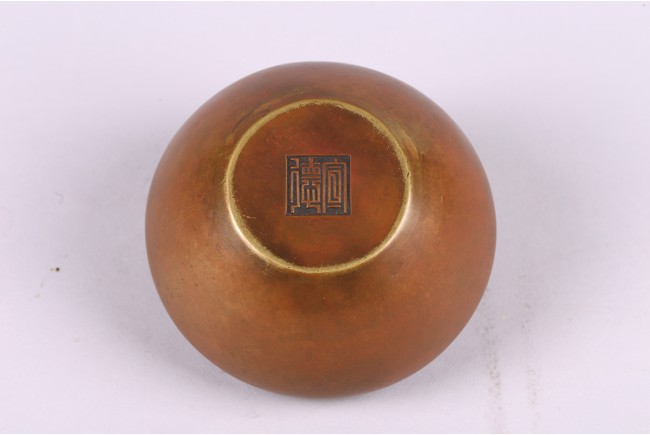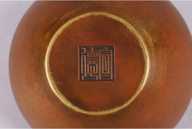 Cast with a compressed globular body with a lipped rim surrounded by a broad shoulder, the concave foot with a two-character mark, Xuande. Qing Dynasty period.