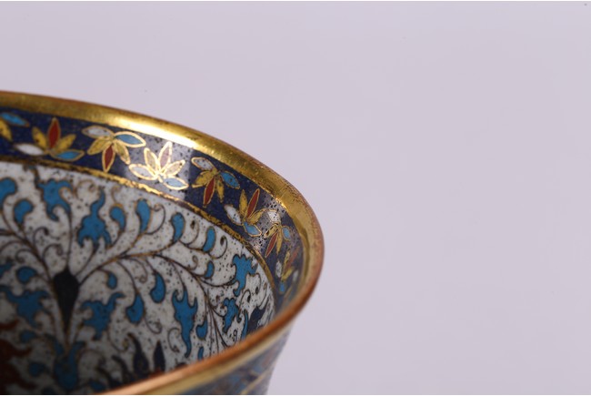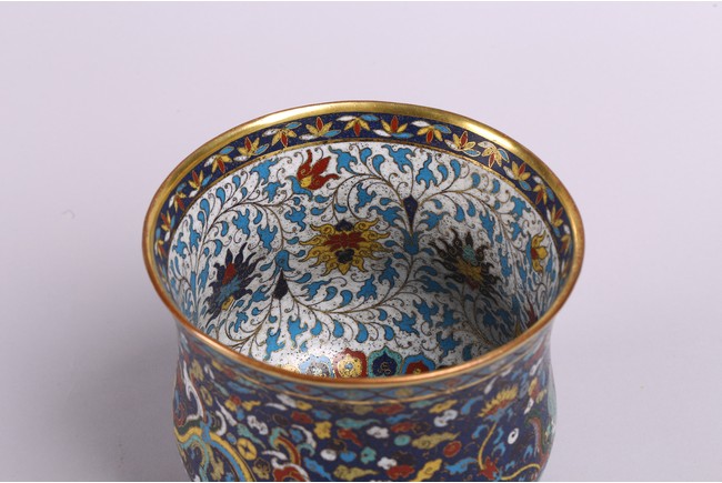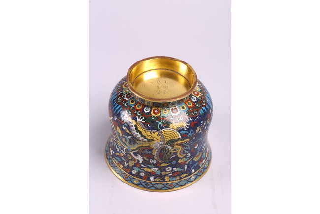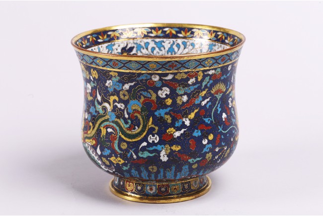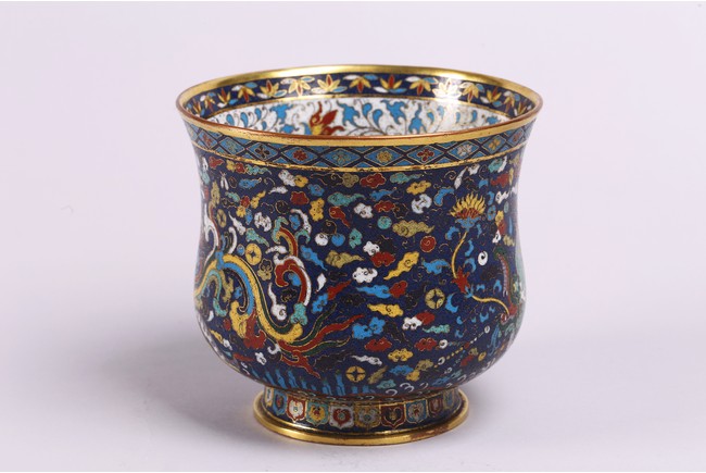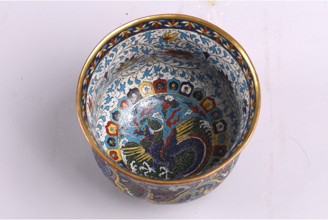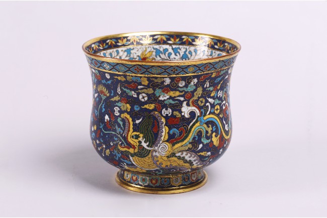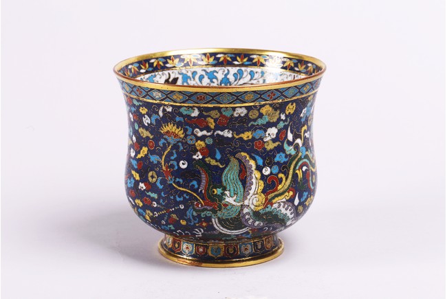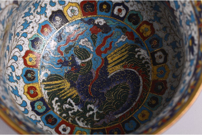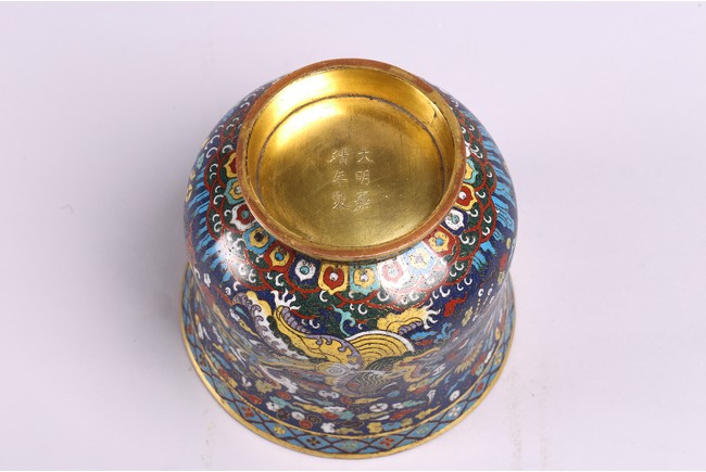 The bowl decorated with two mythical makara with open jaws amidst clouds, all reserved on a dark blue ground, the interior is decorated in the center with a medallion of a winged dragon within a petal-lappet border, and on the walls with scrolling stems bearing lotus blossoms reserved on a white ground, the base incised with apocryphal six character Jiajing mark. Qing Dynasty period, 19th century.