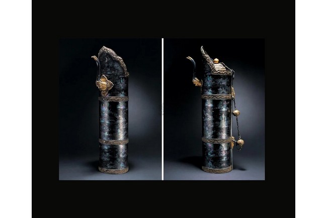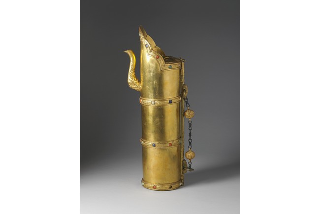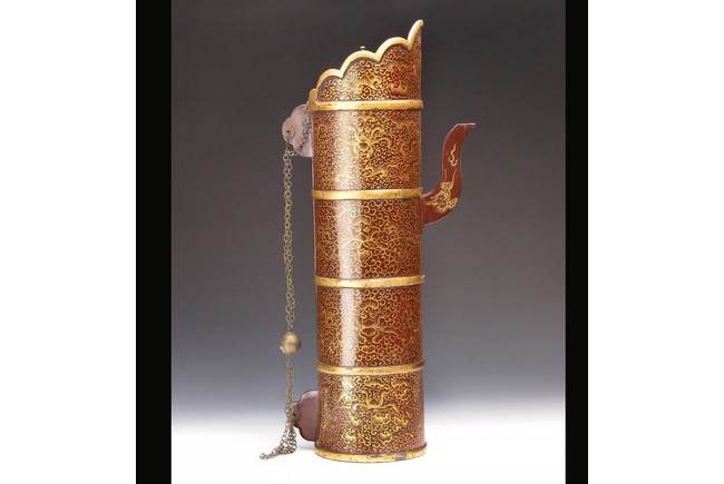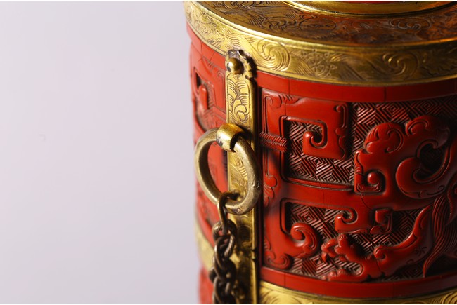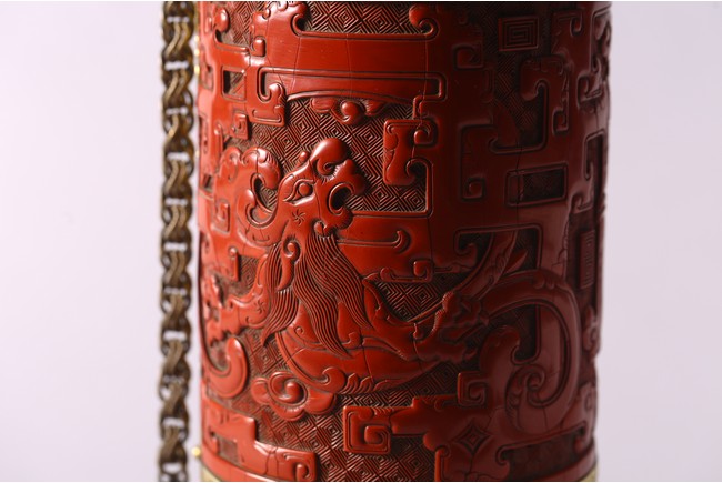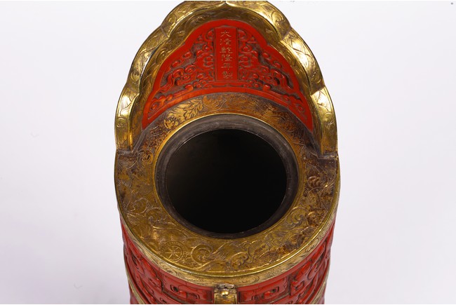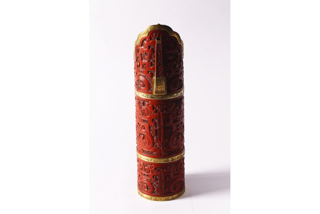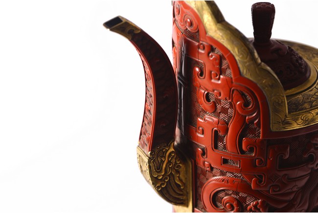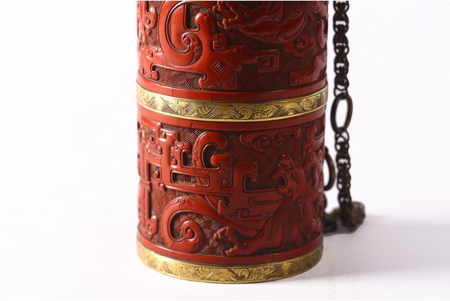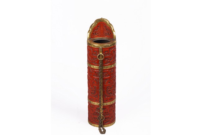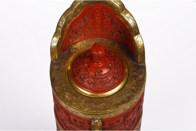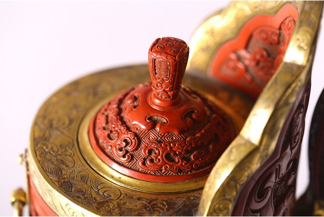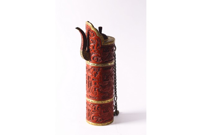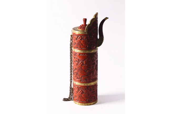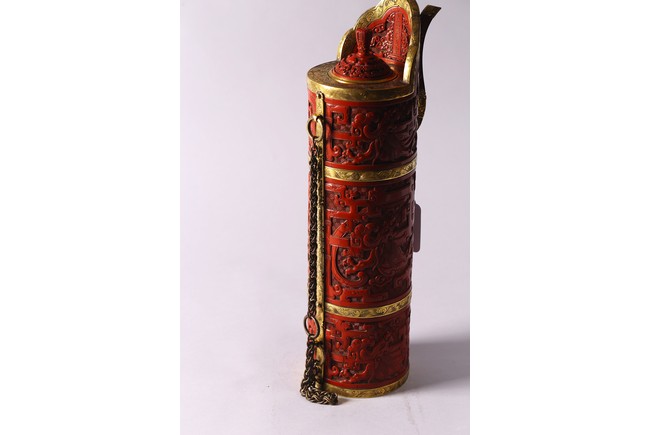 Provenance: Property from an important private collection in Portland, Oregon 來源: 俄勒岡州波特蘭市重要私人收藏 乾隆時期的宮廷剔紅制品以其精美的雕刻和鮮豔的紅色而著稱。這件瓶子即為此類剔紅漆器的代表性例子,其西藏風格的多穆壺瓶身尤為稀少。多穆壺為藏人拌、盛酥油茶的器皿,藏語稱為董莫(mdong-mo)或多穆。酥油茶藏語稱恰穌瑪,是將由茶磚熬成的濃茶中,倒入少量的酥油和鹽,有的還加入一些味精和牛奶等佐料,攪拌至水和酥油交融而成,是藏族同胞生活的必需品,後于元代傳入中原。這種形狀的清代宮廷多穆壺有多種材質製成,包括瓷器、景泰藍、銅鎏金、和漆器。可參考一件清代金制的西藏風格多穆壺,收藏於臺北國立故宮博物院;一件清代棕漆鎏金彩畫的多穆壺,收藏於中國遼寧瀋陽故宮博物院;以及一件康熙時期黑漆鑲嵌珍珠母的西藏風格多穆壺,2009年於北京保利拍賣以人民幣 3,136,000元售出。 The Qianlong period cinnabar lacquer production is characterised by its crisp, confident carving and brilliant red hue. The present ewer is a particularly fine example of such lacquer ware, and it is remarkable to find one in the form of Tibetan style ewer, or duomuhu. The duomuhu shape is derived from a Tibetan prototype, the bey lep, which was used for storing milk tea in Lamaist monasteries. It has a long history in China beginning in the Yuan dynasty when the religion first was adopted under Kublai Khan. Ewers such as the present lot were produced in a variety of materials, including porcelain and cloisonné, gold, and lacquer. Compare a Qing Dynasty gold Tibetan style ewer embellished with jewelry beads, in the collection of National Palace Museum, Taipei; a Qing Dynasty brown lacquer and gilt painted Tibetan ewer in the collection of Shenyang Imperial Palace Museum, Liaoning, China; and a Kangxi period black lacquer mother-of-pearl inlaid Tibetan style ewer, sold in Poly Auction, Beijing in 2009 for RMB 3,136,000.