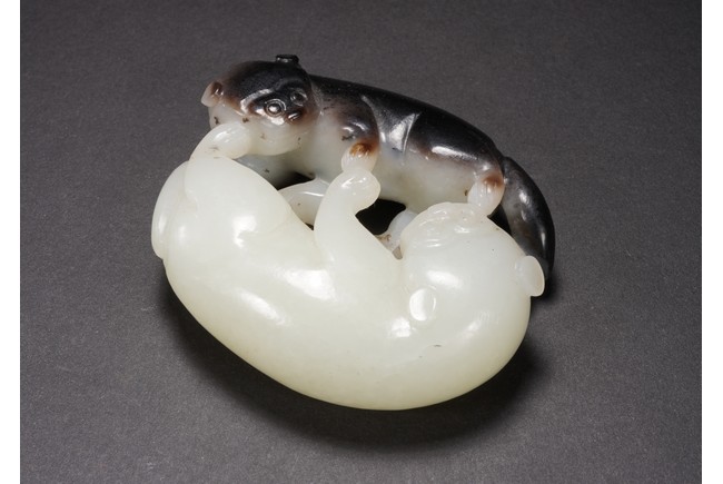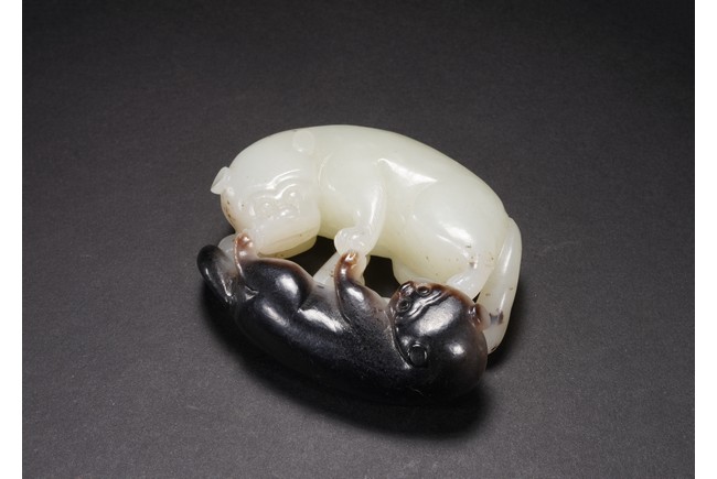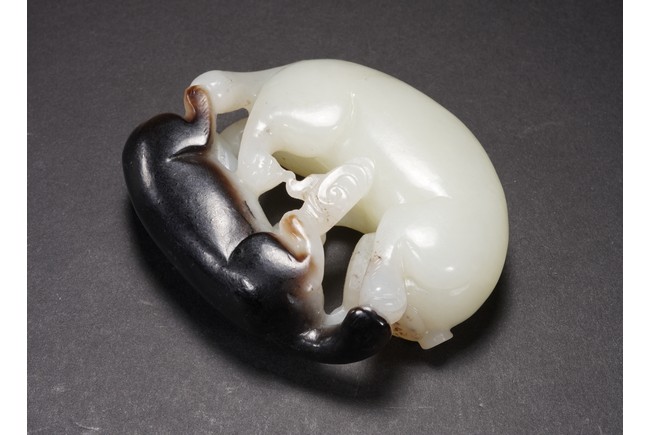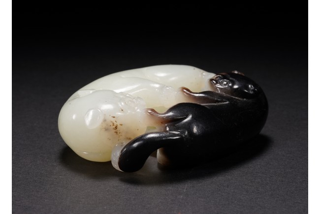 The pendant is carved in the form of two white and black jade recumbent cats lying beside one another. Qing Dynasty period.