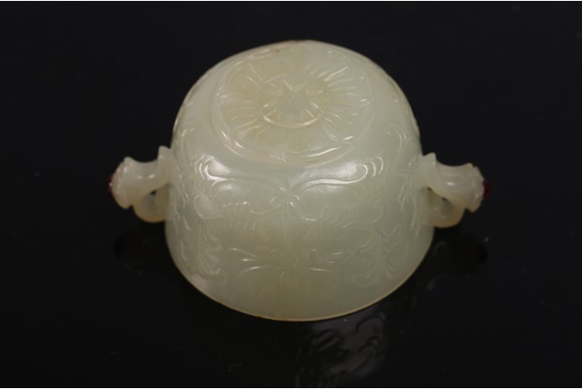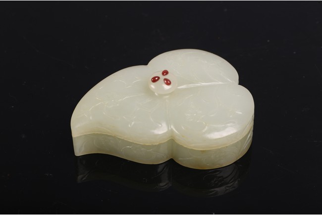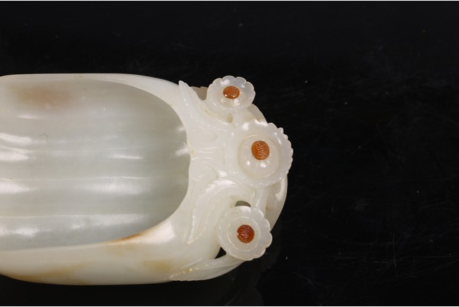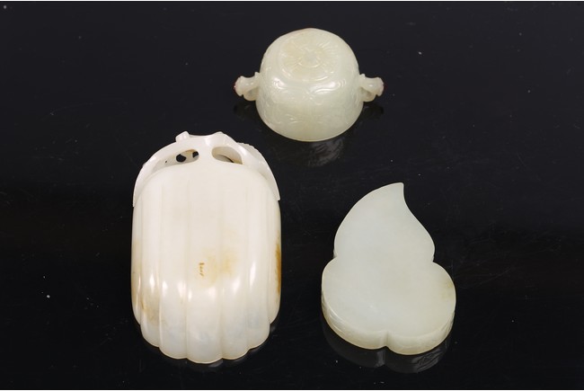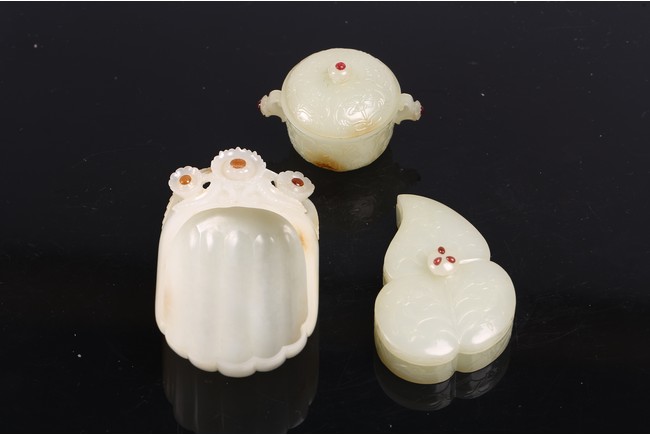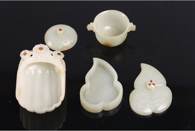 Consisting of three white jade mughal style boxes and washer, each thinly carved in shallow relief with flowers and inset with jewels. Qing Dynasty period or Republic period.