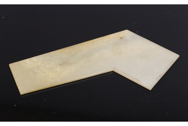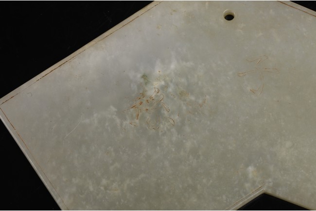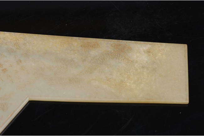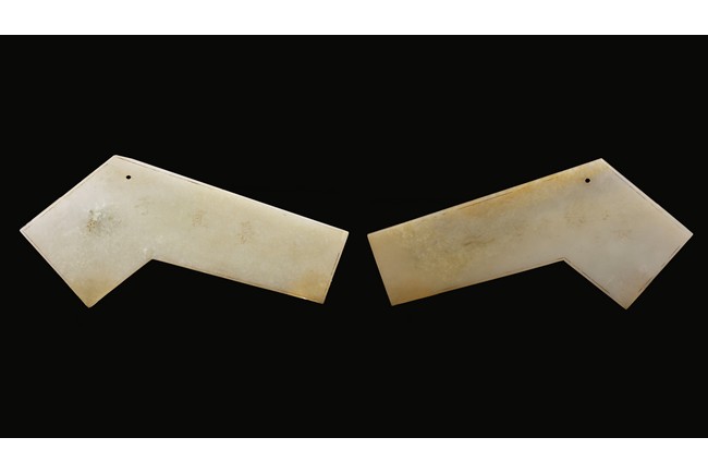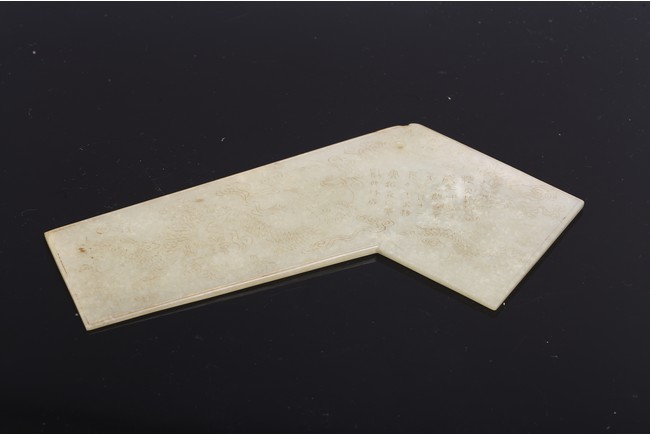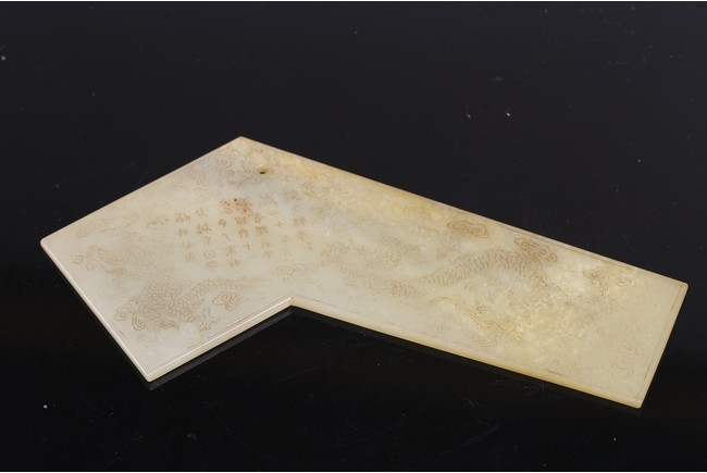 Each angled stone is finely decorated in gilt on each side with two ferocious five-clawed dragons contesting a flaming pearl pierced with a perforation for suspension, enclosing an inscription written in seal script, the reverse inscribed with four characters. Qing Dynasty period.