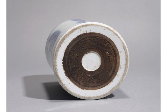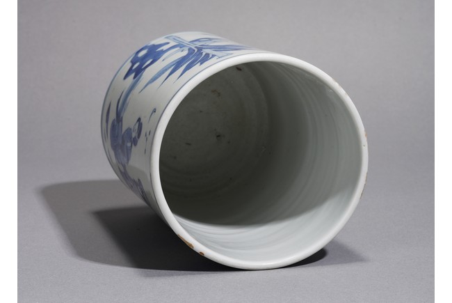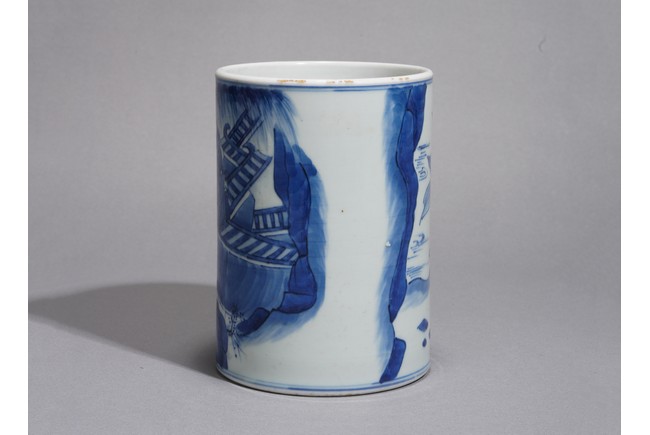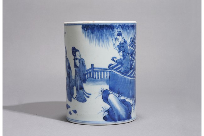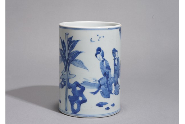The cylindrical brushpot finely painted around the exterior to depict a young literati figure and and two lady figures in a garden setting. Qing Dynasty period.