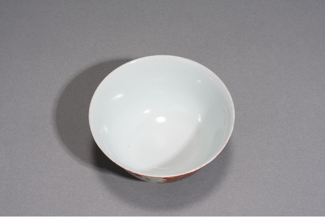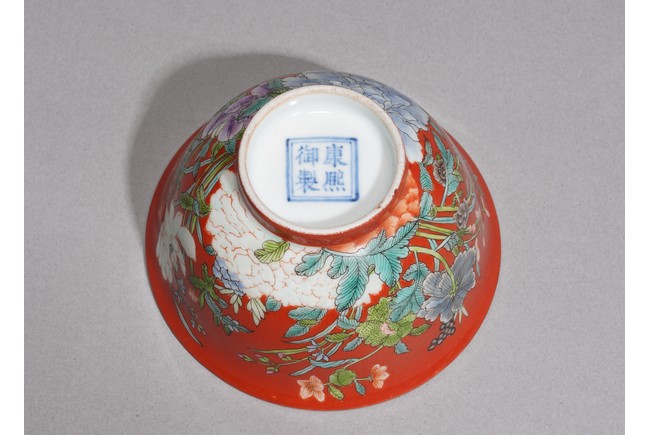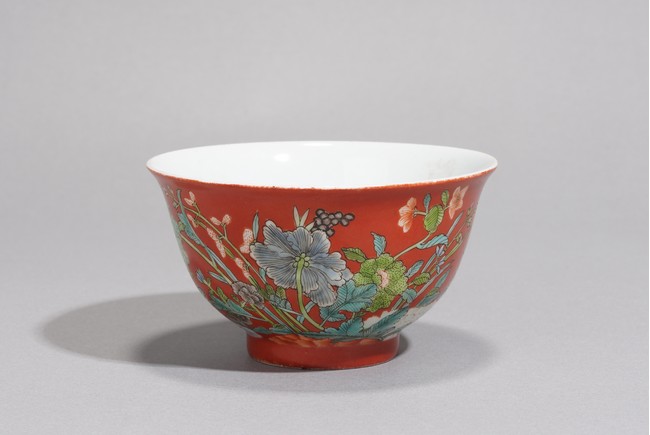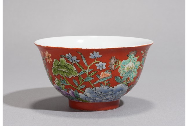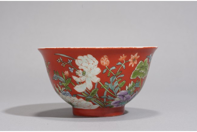 Finely potted with deep rounded sides, raised on a short slightly spreading foot, the exterior delicately enameled in yellow and shades of green, blue, red, black and aubergine, the details picked out in black, with numerous flowers, all reserved on a rich coral-red ground. The baes inscribed with apocryphal reign mark. Republic period.