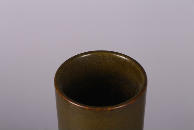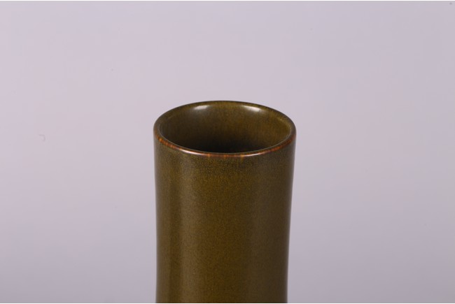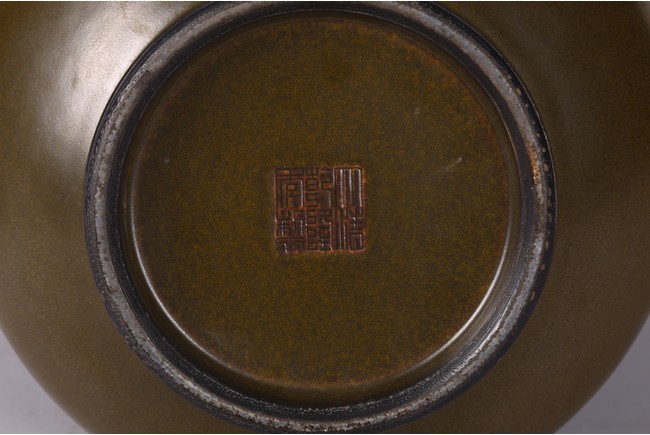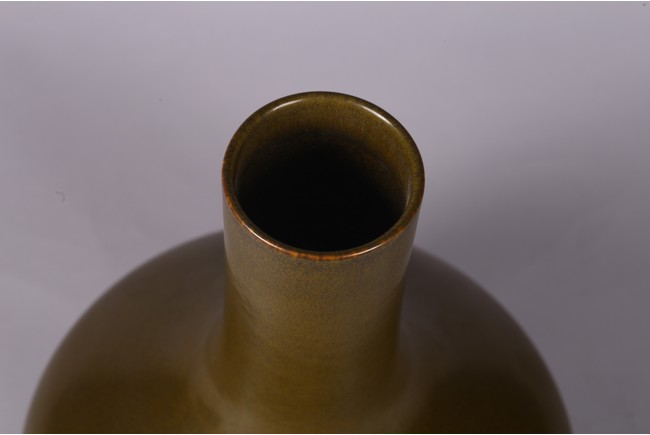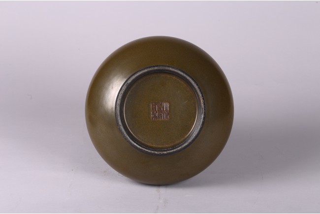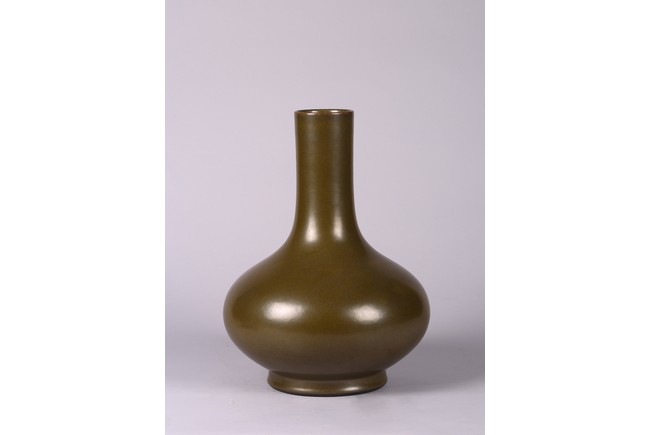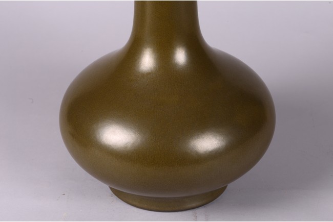 The vase is covered overall with an opaque glaze of finely mottled dark yellowish-green color that continues into the interior and also covers the base. The foot is covered with a dark wash. The base inscribed with six character reign mark. Qing Dynasty period.