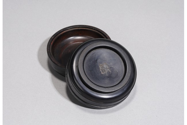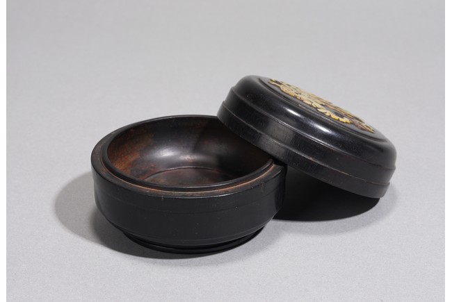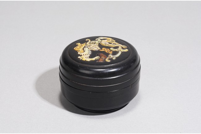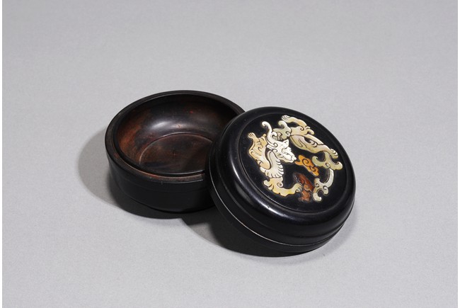 Circular in shape, the domed cover is adorned with sinuous chilong creature stepping on lingzhi-like cloud motif, crafted from mother-of-pearl and agate. The base features a silver-inlaid four-character mark reading 'Wumen Zhou Zhu' (Zhou Zhu from Suzhou). Qing Dynasty period.