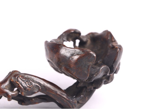 The rich caramel-colored aloeswood is naturalistically carved in high relief as a gnarled and twisting stem of lingzhi fungus, with large curled fungus forming the head at one end and various smaller fungus formations at the back. The wood is of characteristic aloeswood aroma. Qing Dynasty period.