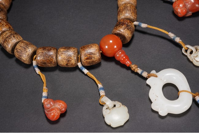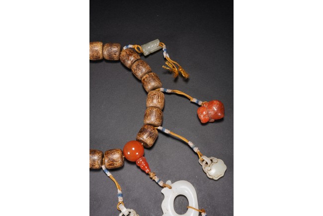 The bracelet consists of eighteen large aloeswood beads, suspending multiple white jade and agate toggles. Qing Dynasty period.