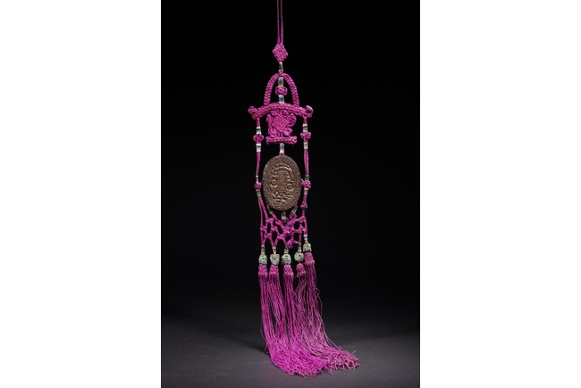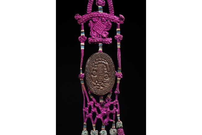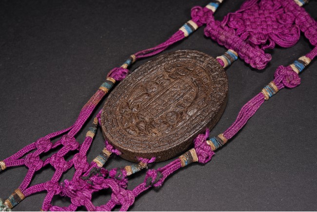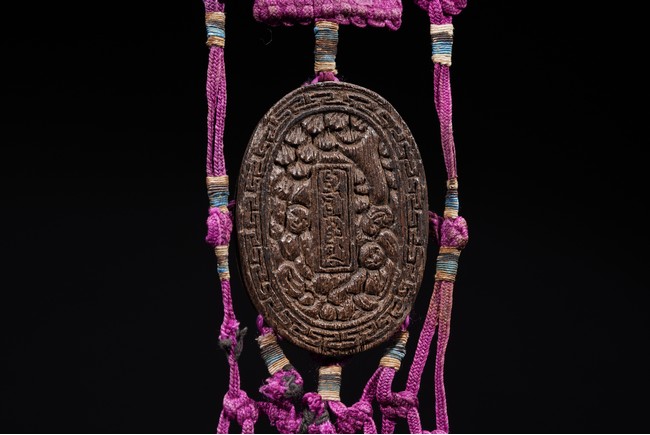 The oval shaped pendant carved in relief with figures flanking two characters. The wood is of characteristic aloeswood aroma. Qing Dynasty period.