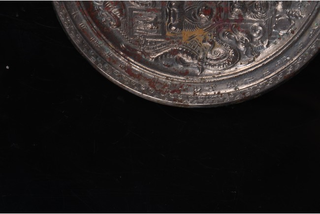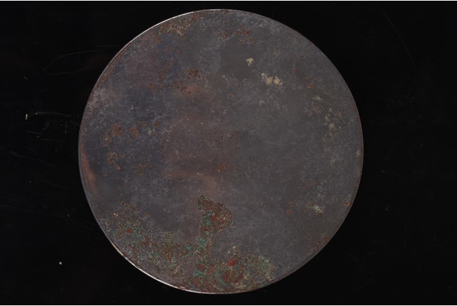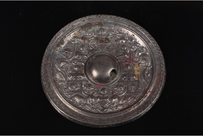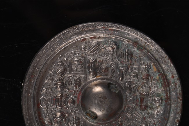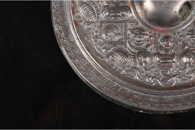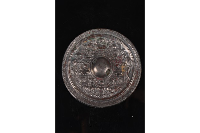 The knob surrounded by a various seated immortals and mythical beasts, all crisply cast. Possibly Han Dynasty period.