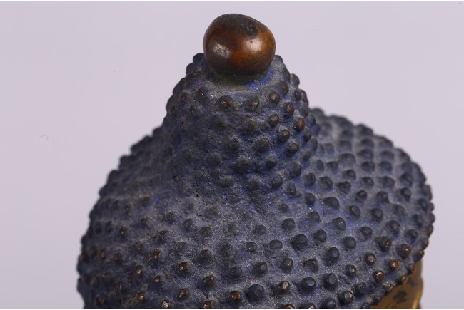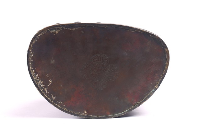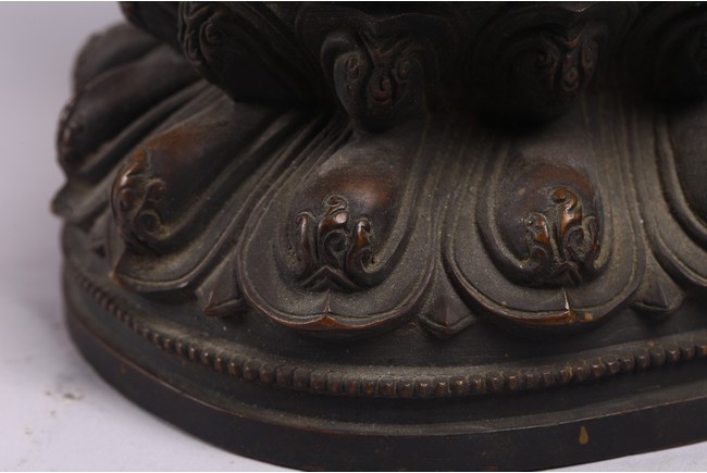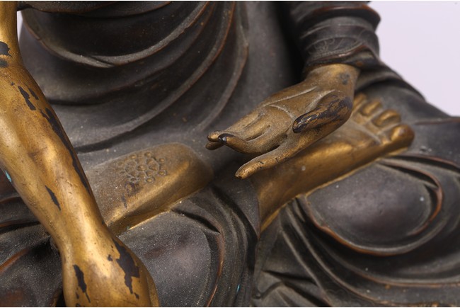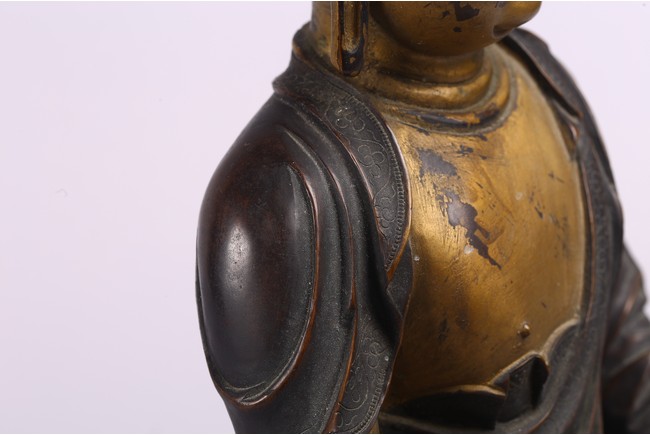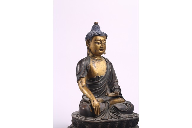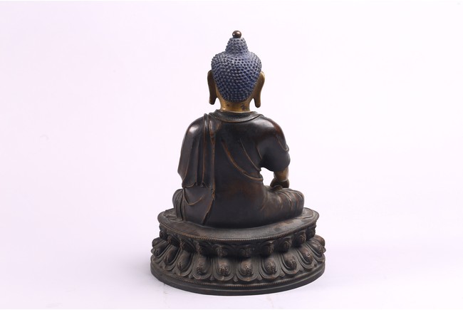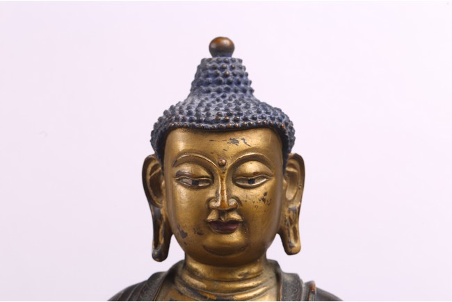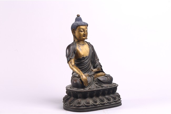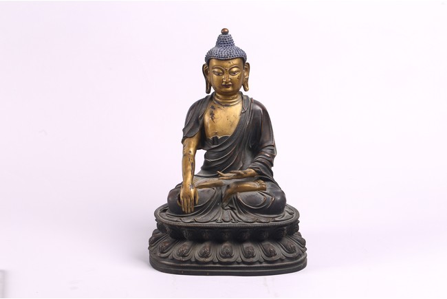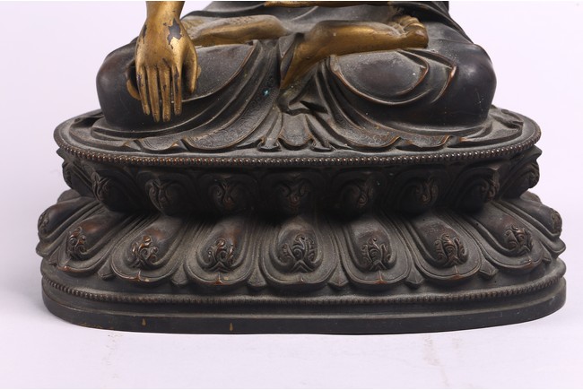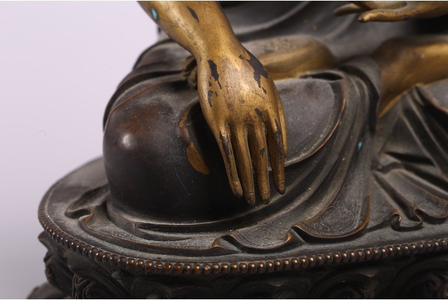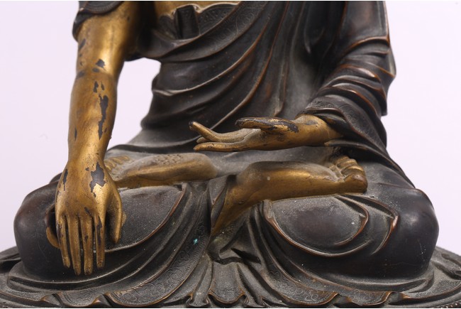 Seated in dhyanasana on a double-lotus base, with his right hand in bhumisparsha mudra, his left hand in dhyana mudra, wearing a diaphanous robe falling in undulating folds around the legs, the serene face with downcast eyes and a meditative expression, flanked by long ears with pendant pierced lobes. The cold-gilt face, chest, arms, and feet exhibit traces of age-related wear. Qing Dynasty period.