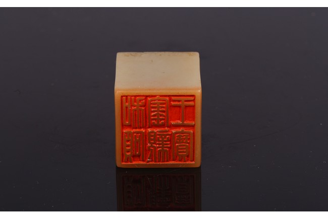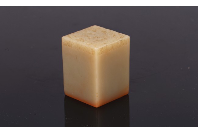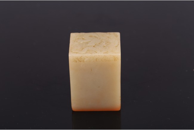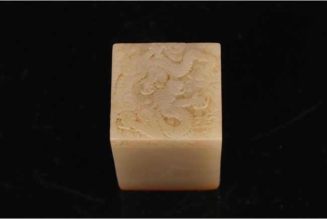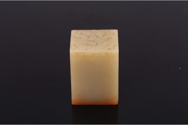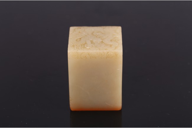 Of square section, the seal intricately carved to the top in shallow relief with a four clawed dragon emerging from clouds. The seal face carved with six characters. Qing Dynasty period.
