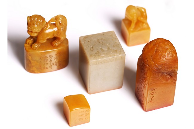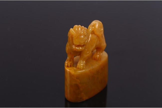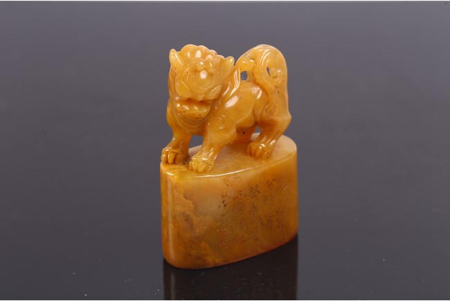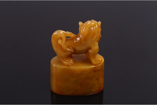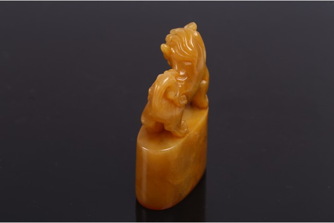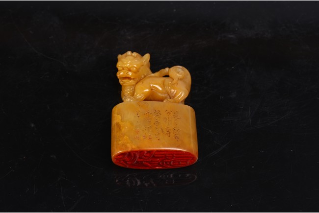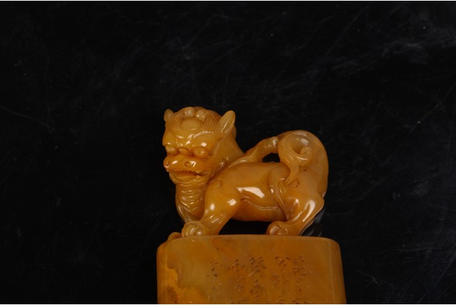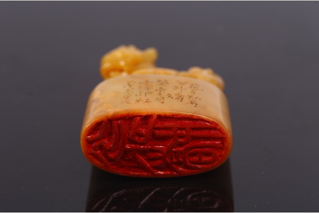 Carved in round with buddhist lion at top, the seal side incised with inscriptions, the seal face carved with two characters. Qing Dynasty period.