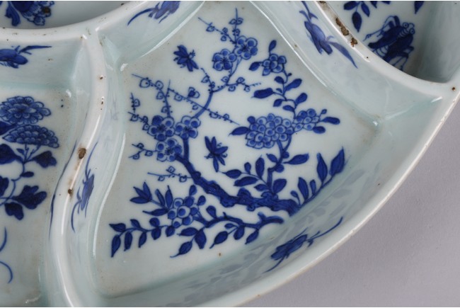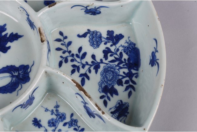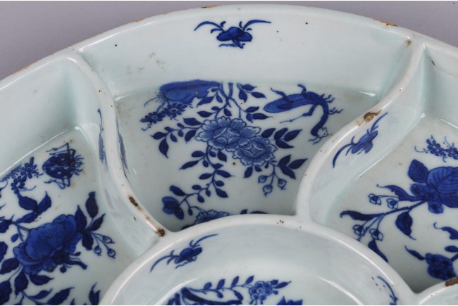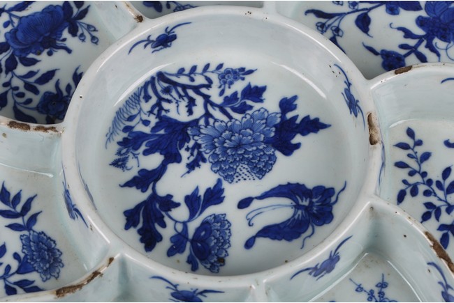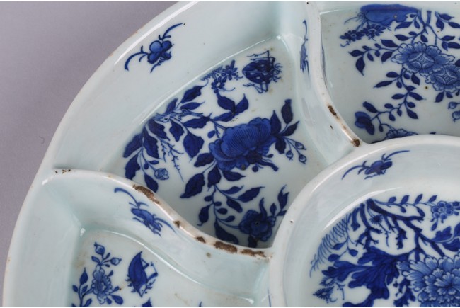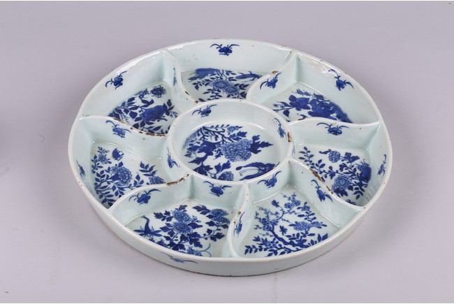 The tray divided into eight sections, each painted in cobalt blue to the base with leafy flowers and insects. The base inscribed with four character mark 'Jiaqing' mark. Qing Dynasty Jiaqing period.