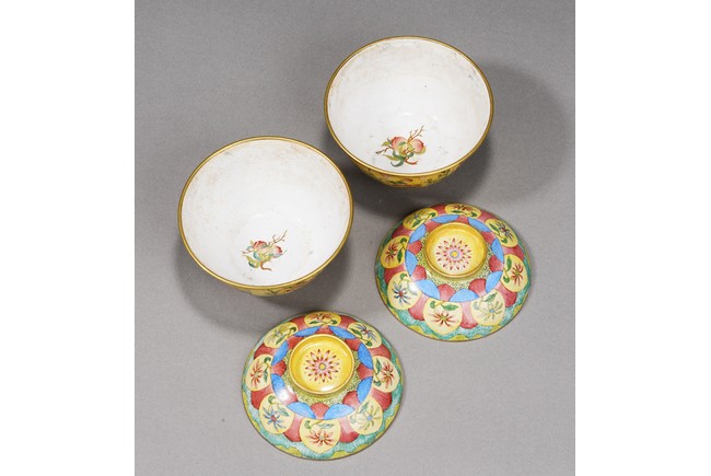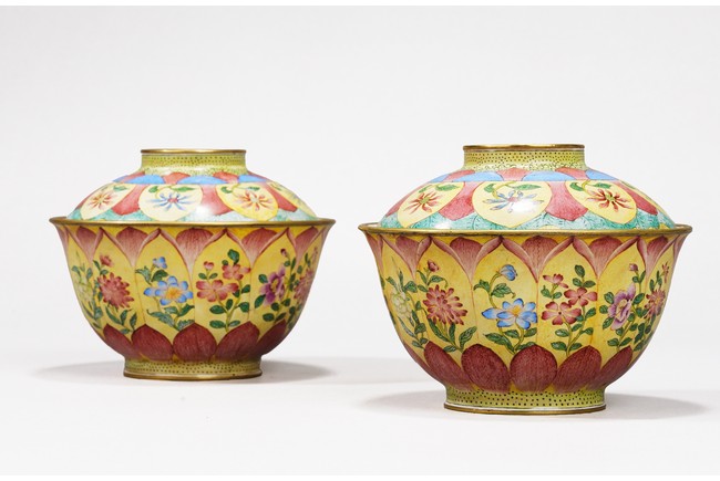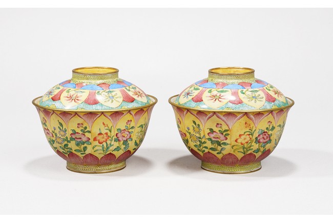 A PAIR OF CHINESE ENAMEL COPPER BOWLS AND COVERS 清 銅胎畫琺琅花卉紋蓋碗一對