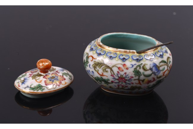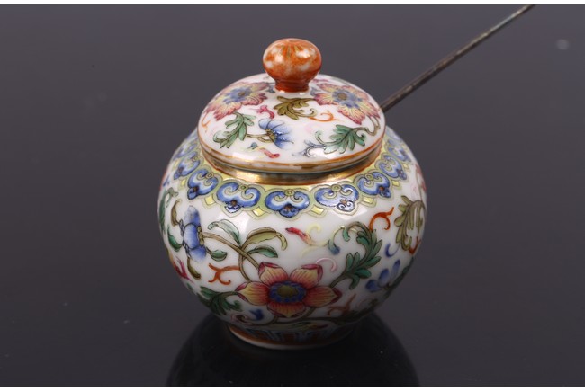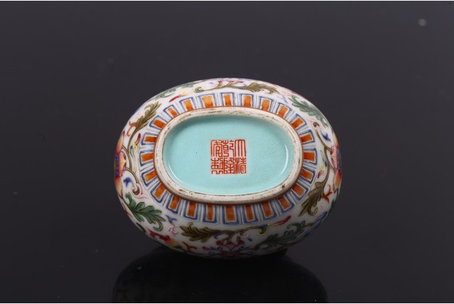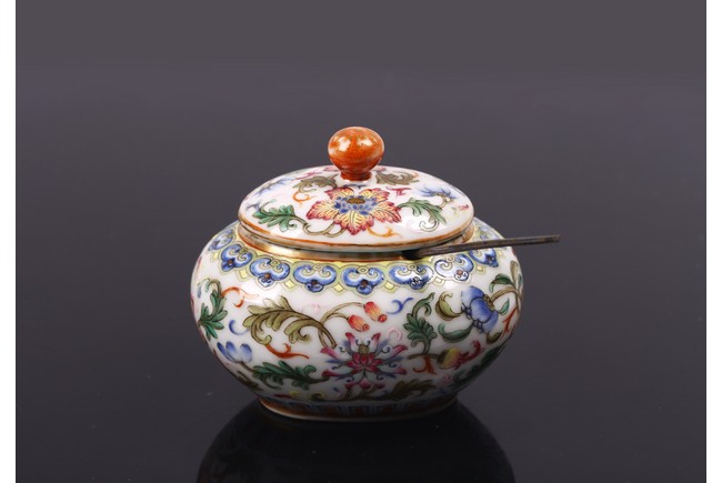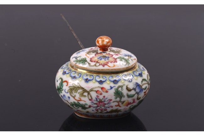 Of compressed globular form, the body enamelled with band of lotus scrolls in between ruyi and upright leaves lappets, the cover similarly painted with floral scrolls, the base with reign mark.