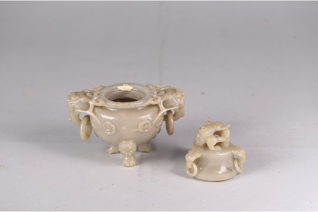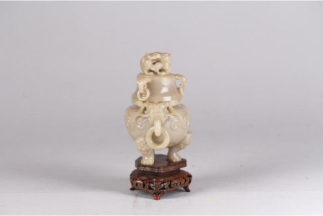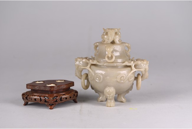 The jade tripod censer carved with pair of mythical beast handles suspended with loose rings. The cover carved with a coiled dragon as finial. Supported on silver wire inlaid wood stand. Qing Dynasty period.