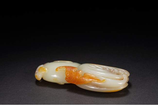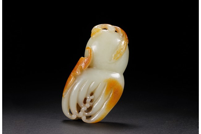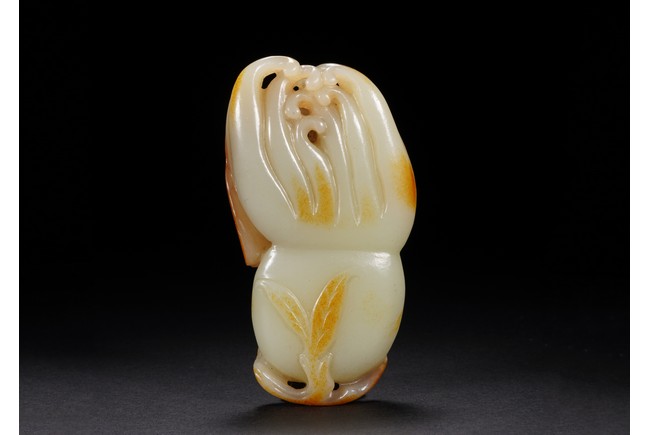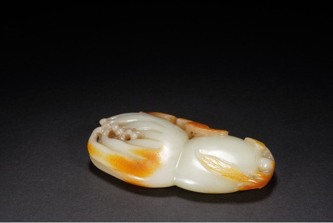 The fruit is finely and naturalistically carved with long tapering tendrils which form the lobes of the fruit, next to bat. The jade is of an even white tone cleverly carved utilising the russet skin as highlights. Qing Dynasty period.