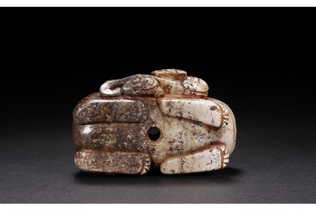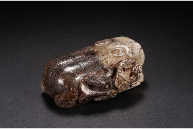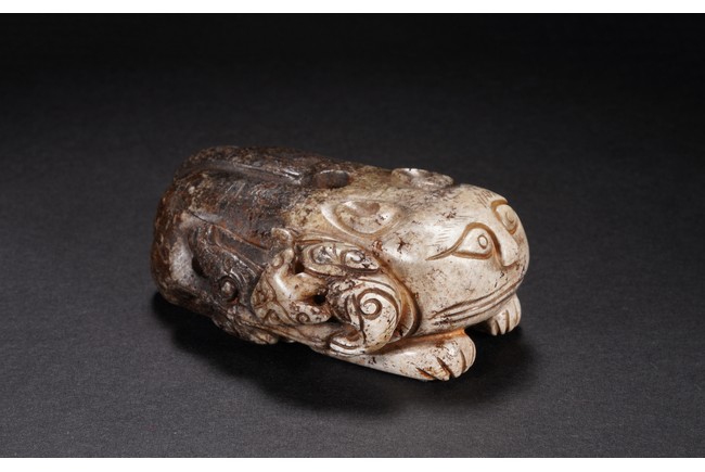 The recumbent feline with feet tightly tucked under its body, the face carved with whiskers and large eyes, right side of her body carved with a kitten. Ming Dynasty period.