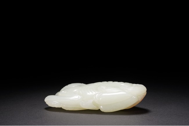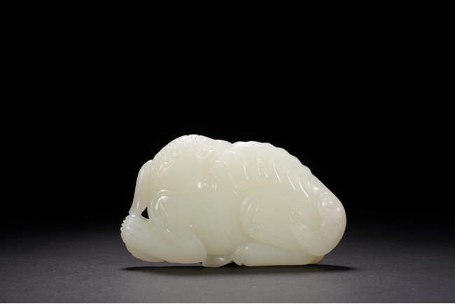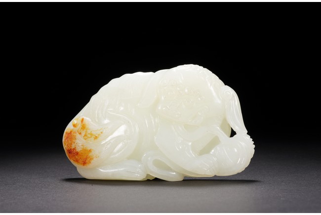 Carved with a recumbent buddhist lion playing a brocade ball. The stone is of even white tone with russet skin highlighting the tail. Qing Dynasty period.