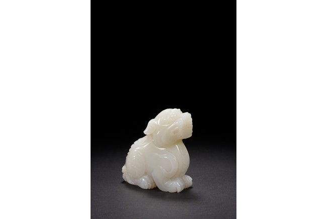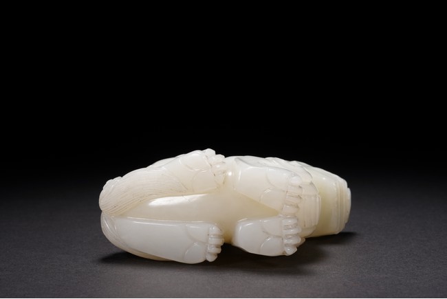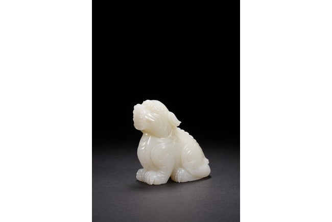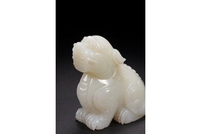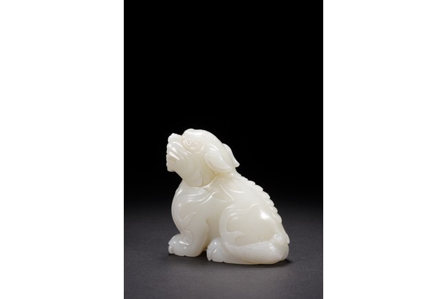 Carved in round as a mythical beast resting on its haunches, the head slightly turned upward, the face rendered with bulging eyes, the details of the flaming haunches and curled tail crisply incised, the polished stone of white tone. Qing Dynasty period.