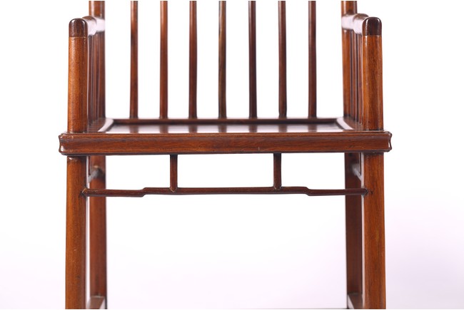Chinese. The stepped spindle-back and arms above the Huali hardwood seat, all supported on legs of round section joined by humpback stretchers with short vertical posts, the base joined by plain stretchers. Qing Dynasty period.