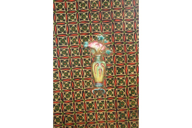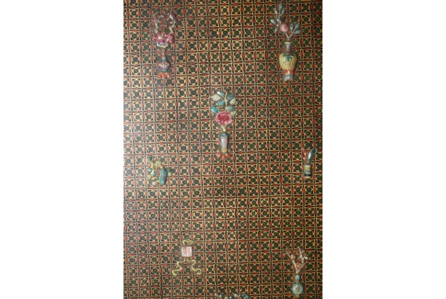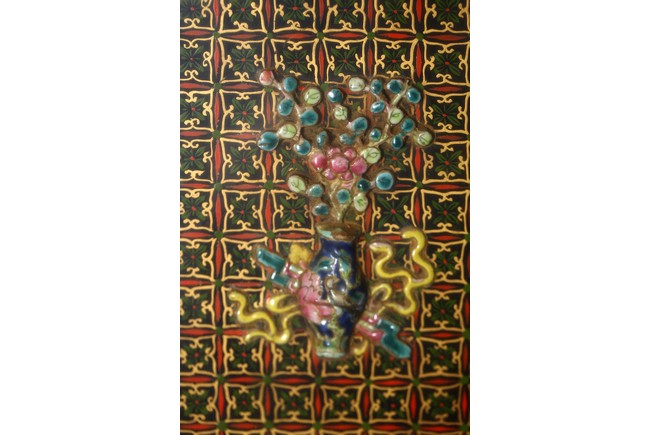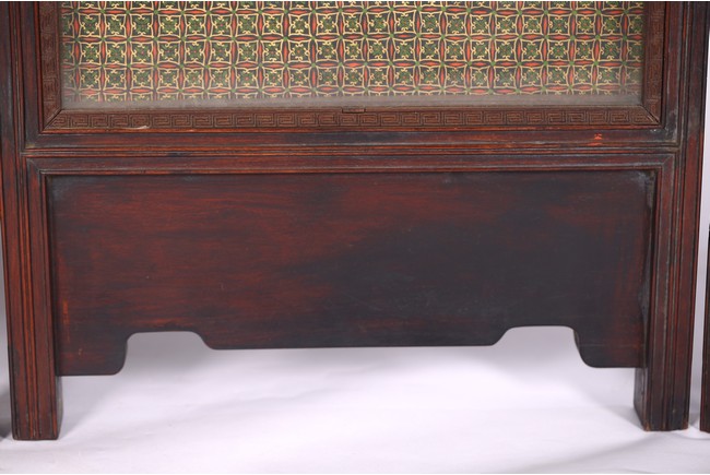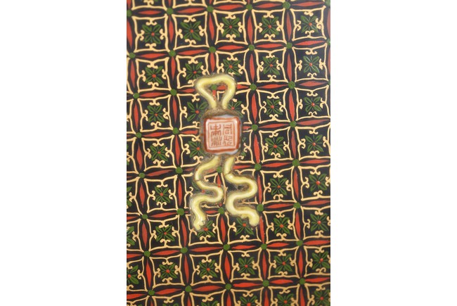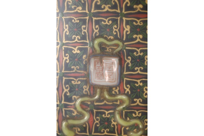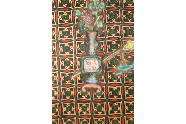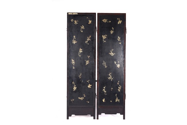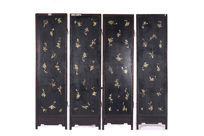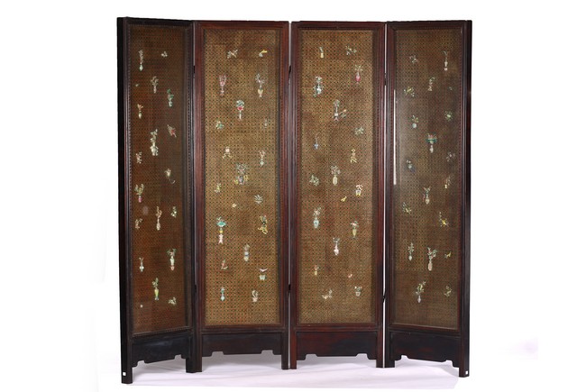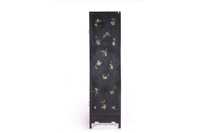 "One side set with inlays of with " A Hundred Antiquities" in famille rose porcelain decorations, including various vases with flowering branches, the reverse gilt on black lacquer with various flowering sprigs. Qing Dynasty period. "