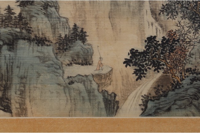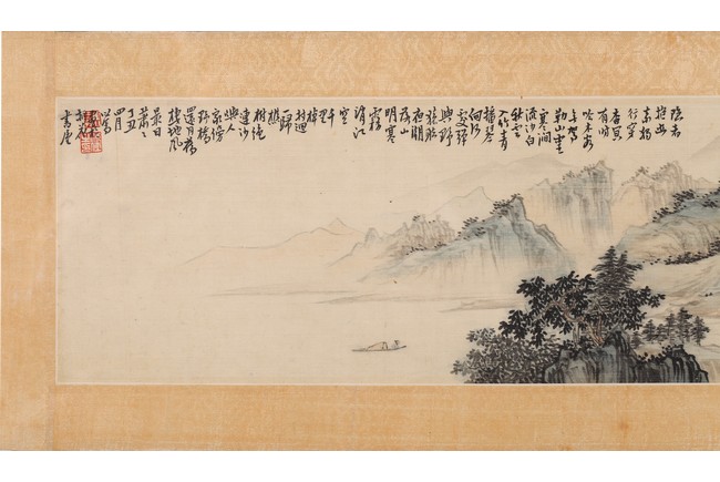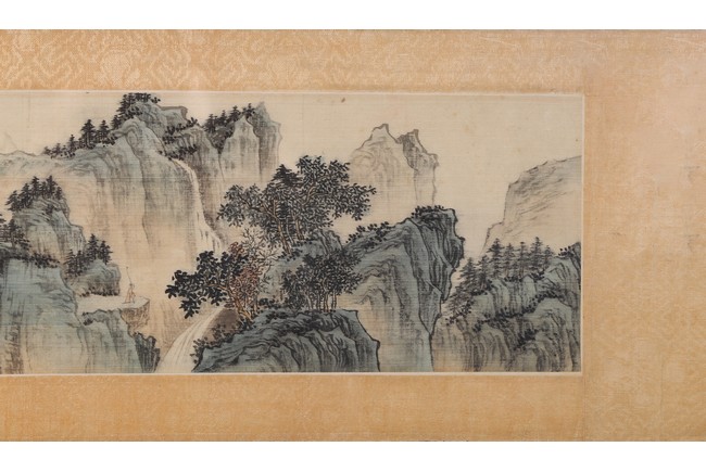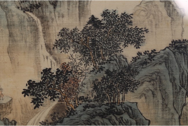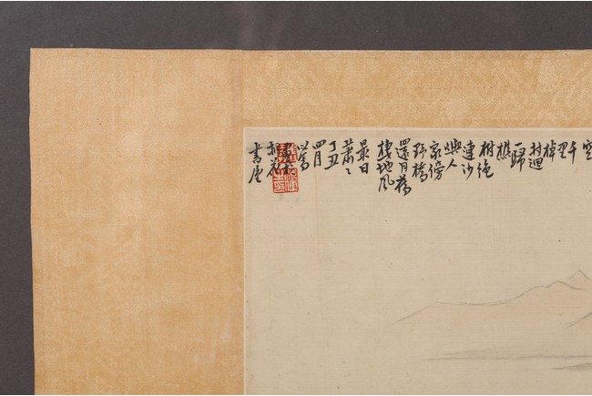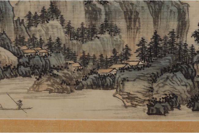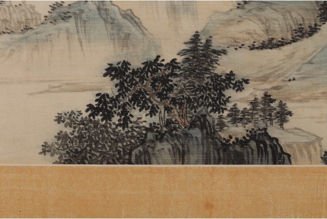 Color and ink on silk. Landscape. Mounted on paper and Framed. Inscribed and signed Xinyu, dated to April 1937, with two seal marks of the artist.
