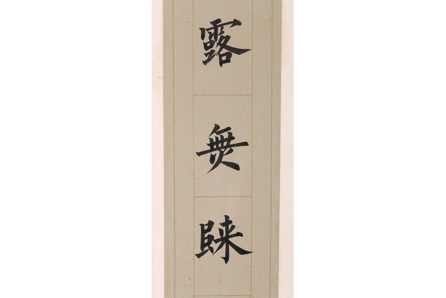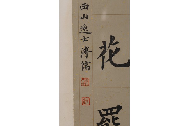 Ink on gold-speckled paper. Seven Character Calligraphy couplet in Regular Script (kaishu), inscribed and signed Pu Ru, with two seal marks of the artist.