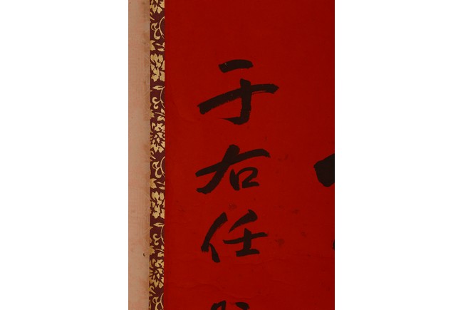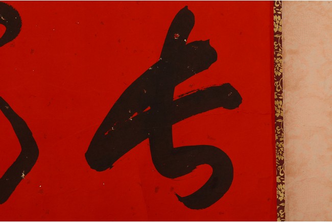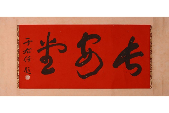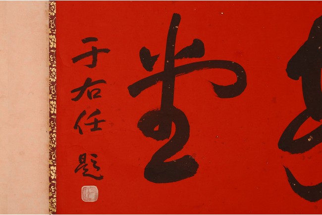 Ink on gold-speckled red paper. Calligraphy in cursive script. Mounted on paper. Signed Yu Youren, with one seal mark of the artist.