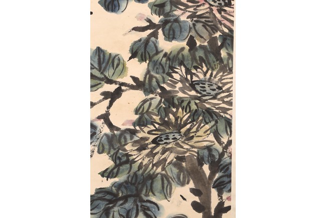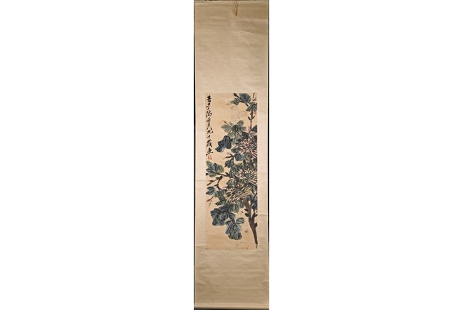 Color and ink on paper. Chrysanthemum. Hanging scroll. Inscribed and signed with one seal mark of the artist.