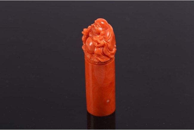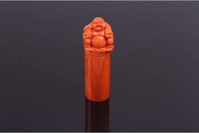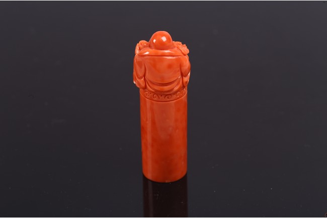 A CHINESE UNCARVED RED CORAL 'MAITREYA' SEAL 紅珊瑚彌勒佛印