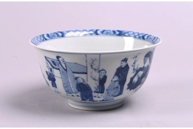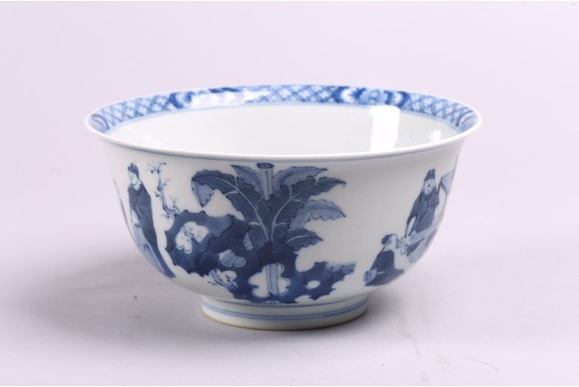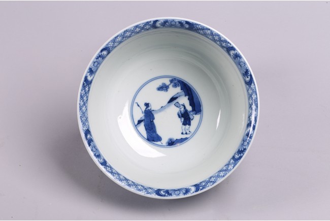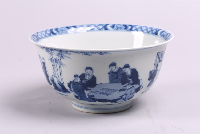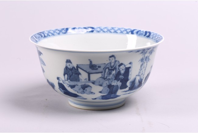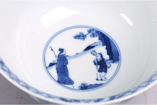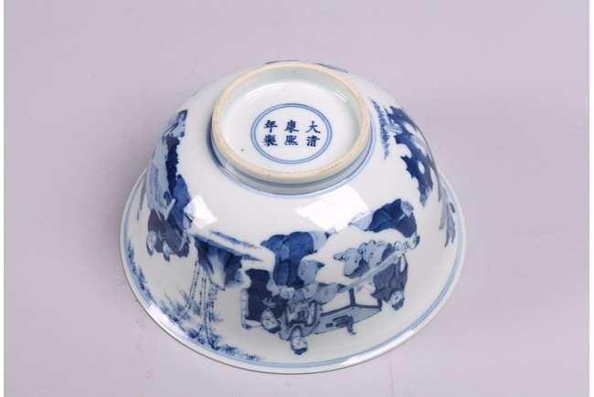 The exterior finely decorated with various scholars accompanied by young attendants engaging in 'literati' activities including painting appreciation and listening to 'Qin' music. The interior further decorated with scene of a scholar asking a young man for directions within a roundel. The base inscribed with apocryphal Kangxi mark. Republic period.