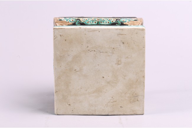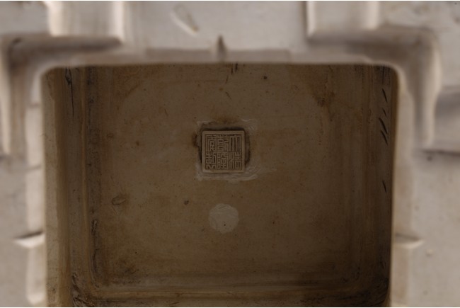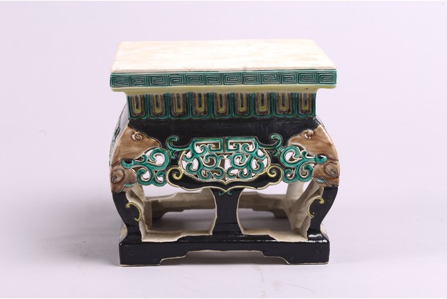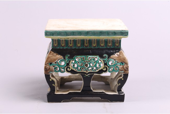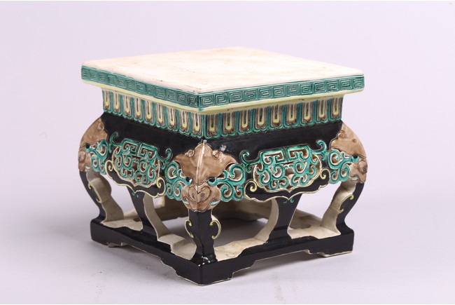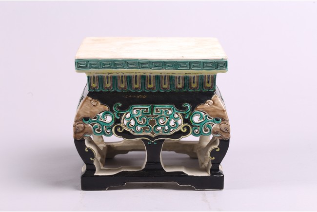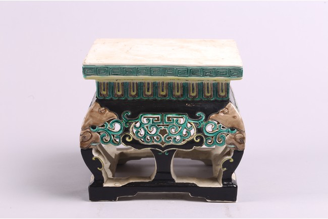 The square plinth raised on waisted lotus petal neck supported on four cabriole legs emerging from mythical beast masks interconnected by reticulated apron, the underside of the stand bears a six character mark. Republic period.