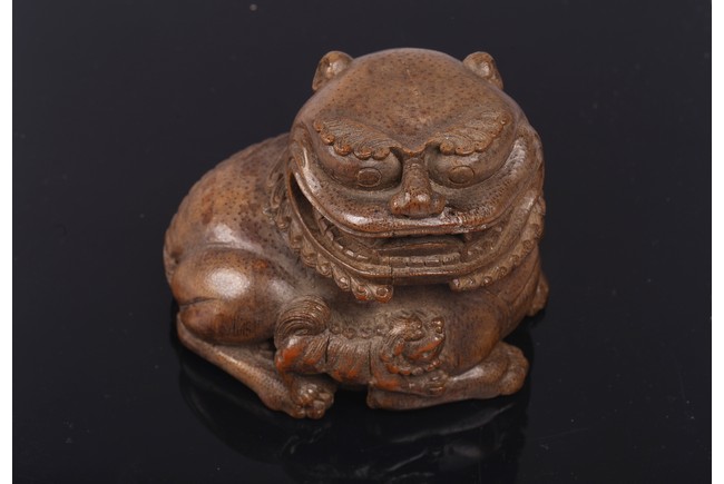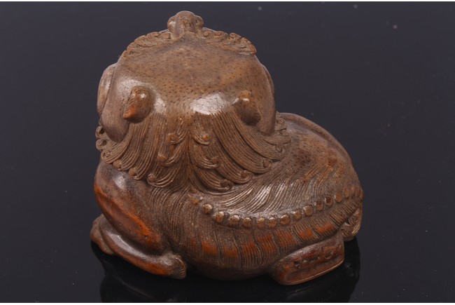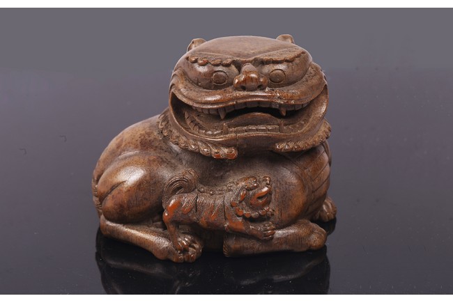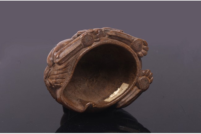 The cup carved in the form of a mother lion turned to one side, the face detailed with bulging eyes and teeth bared, a cub clambering on its side, underside is hollowed serve as the receptacle. Qing Dynasty period.